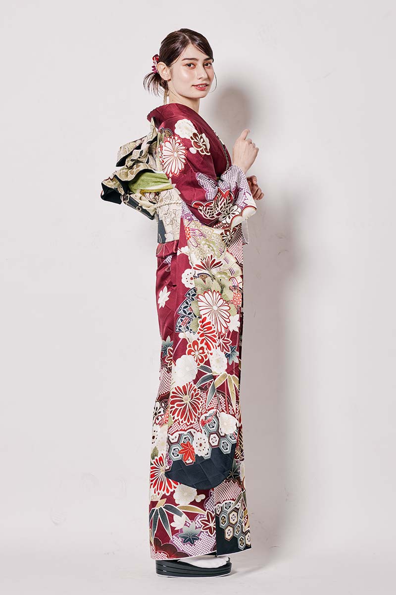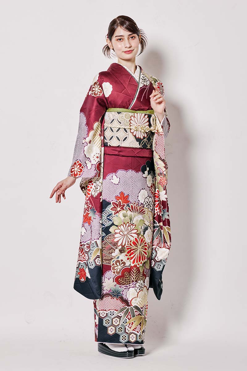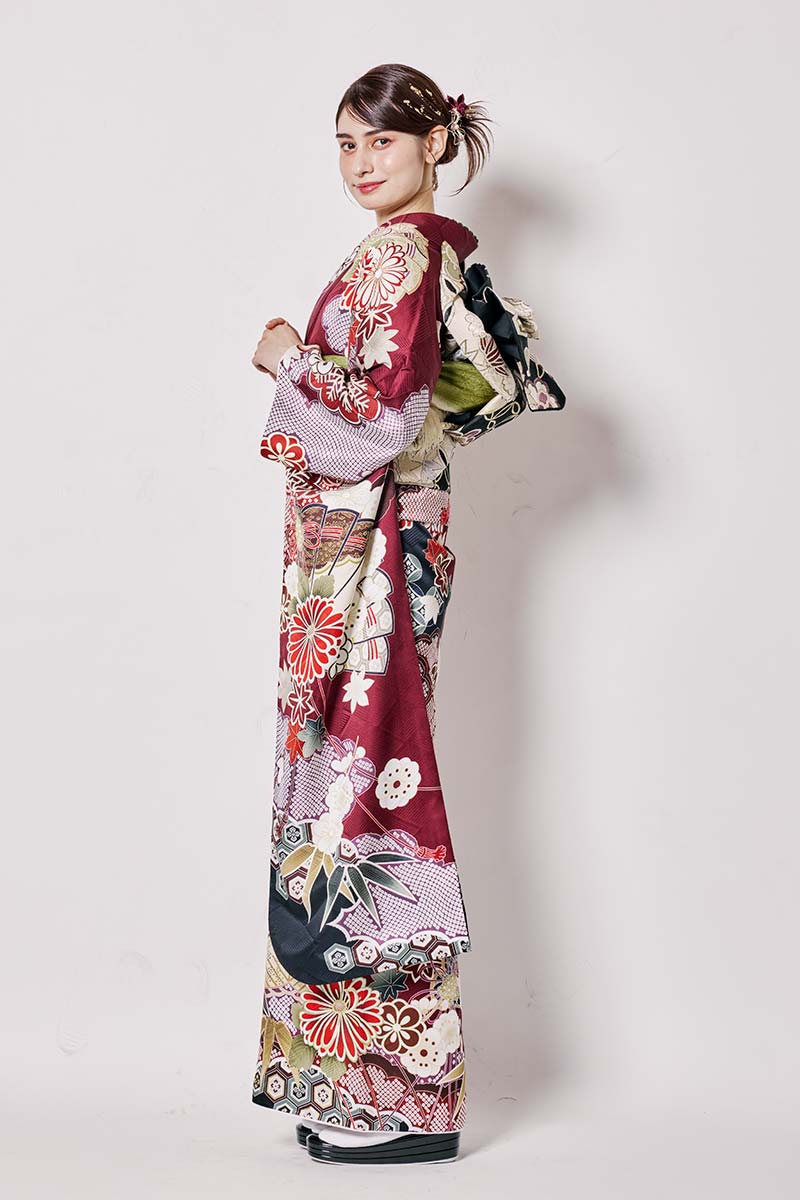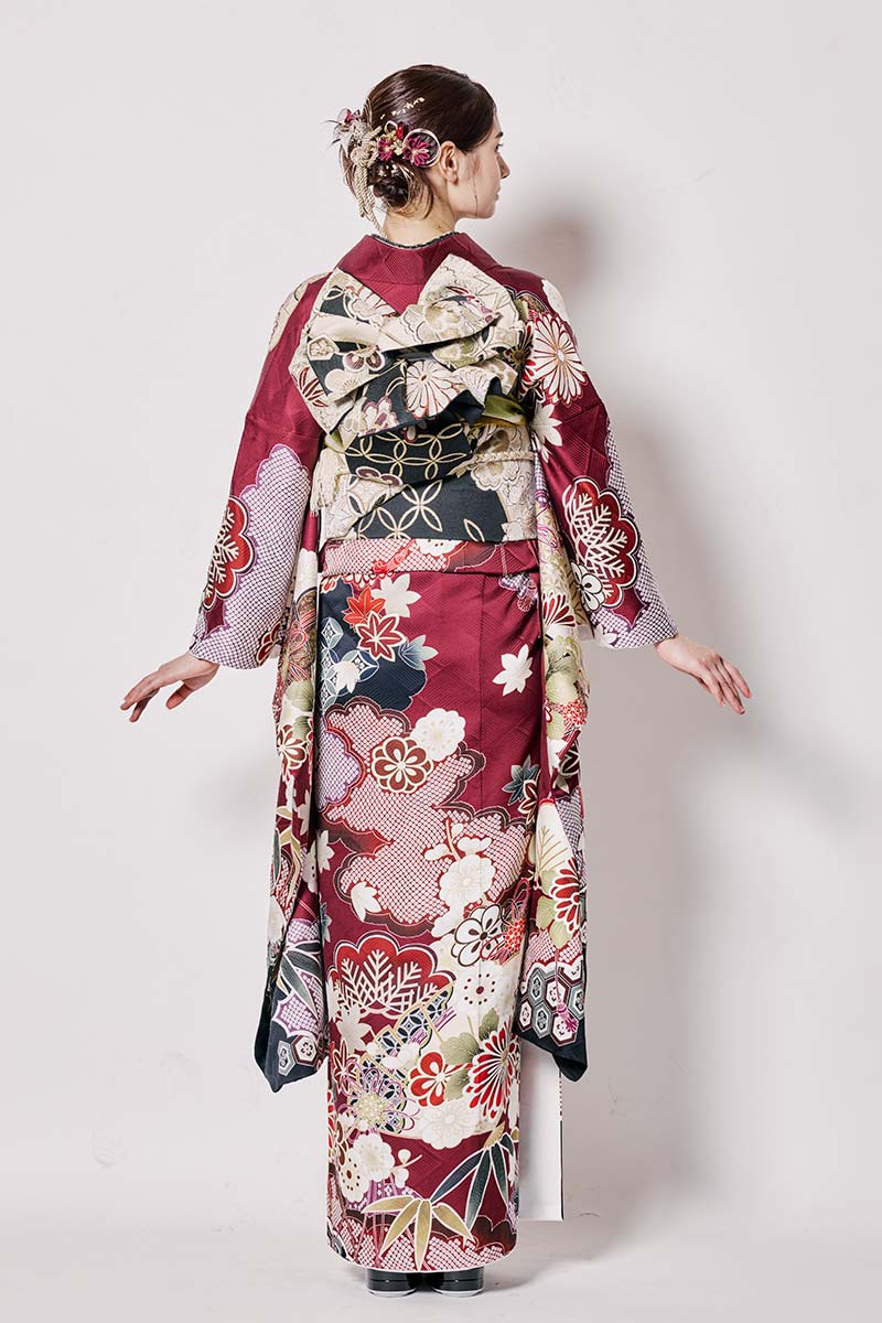 深紅と黒の地色に映える、華やかな古典柄が印象的な振袖。繊細な花模様と重厚感のある色合いが大人の気品を引き立て、格式高いシーンにふさわしい一着です。特別な日を華やかに彩ります。