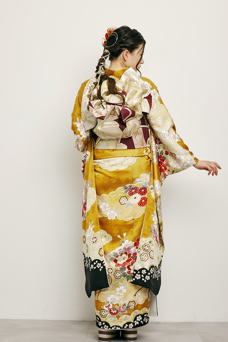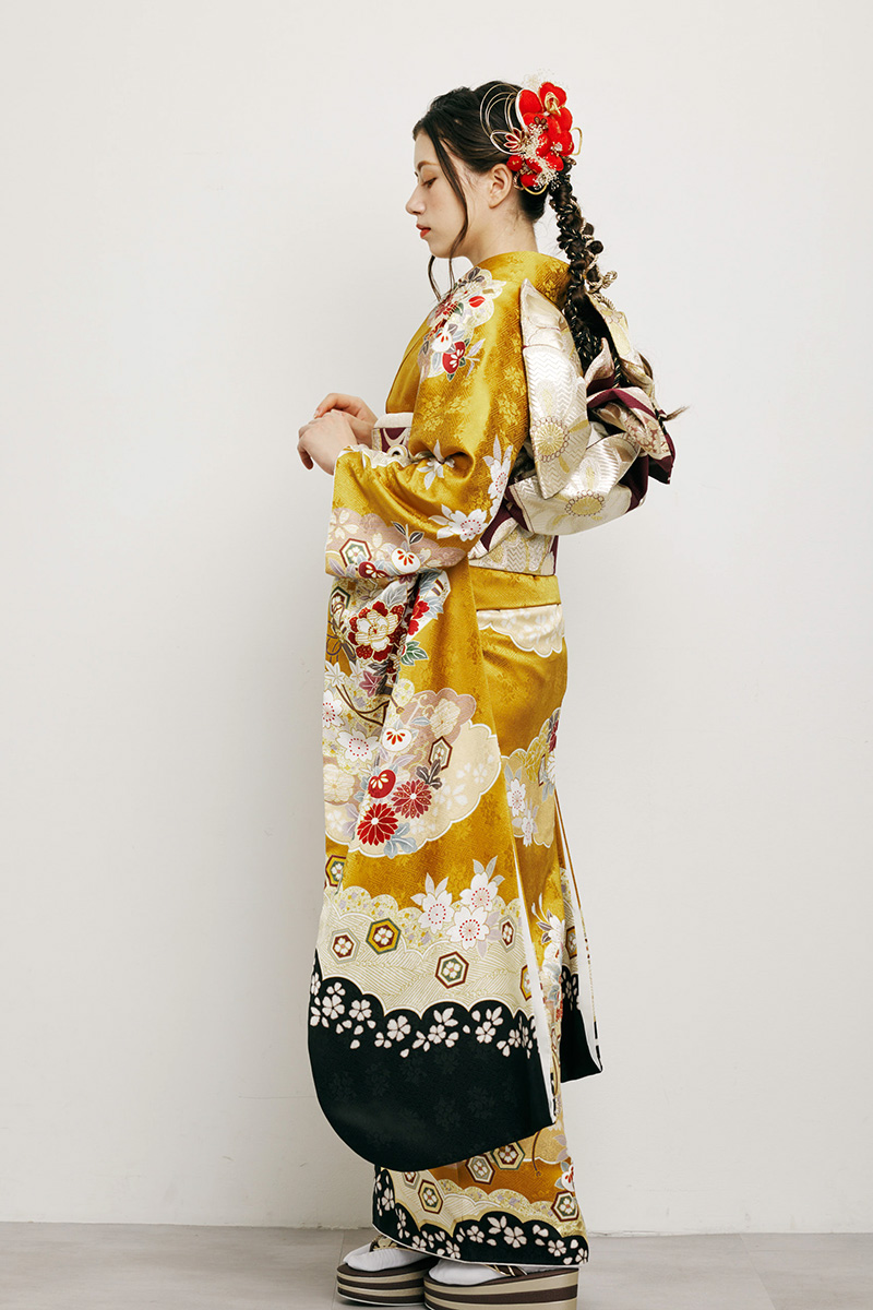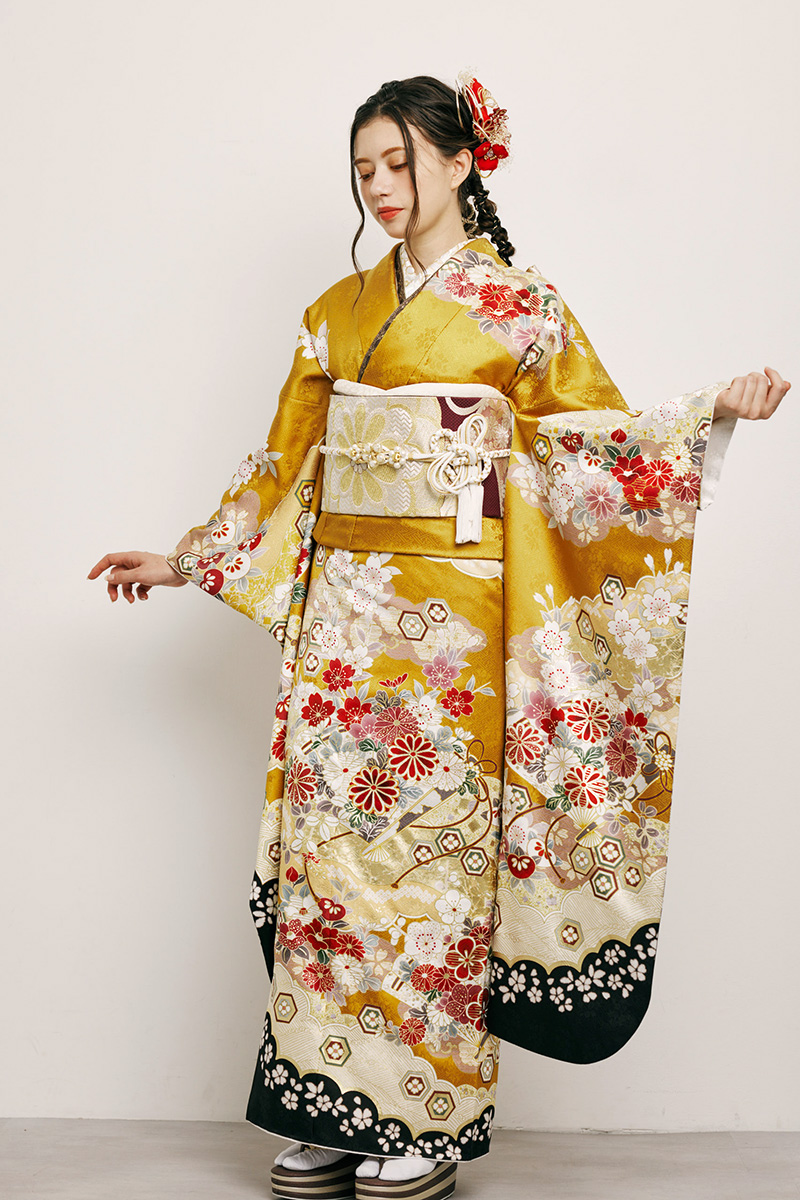 鮮やかな黄金色の生地に、赤や白の花柄が美しく映える振袖。華やかでありながら上品なデザインが、特別な日をさらに彩ります。伝統的な雰囲気とモダンさを兼ね備えた一着で、存在感あふれる装いをお楽しみください。