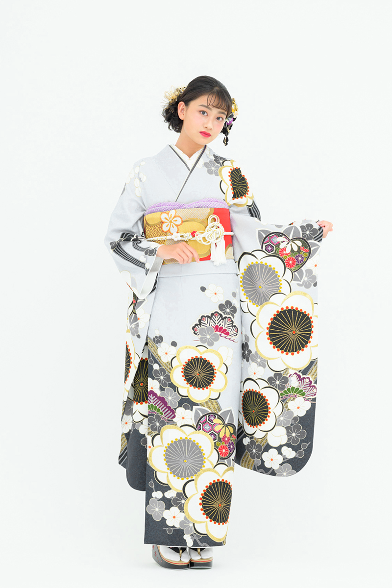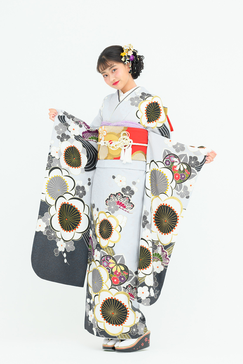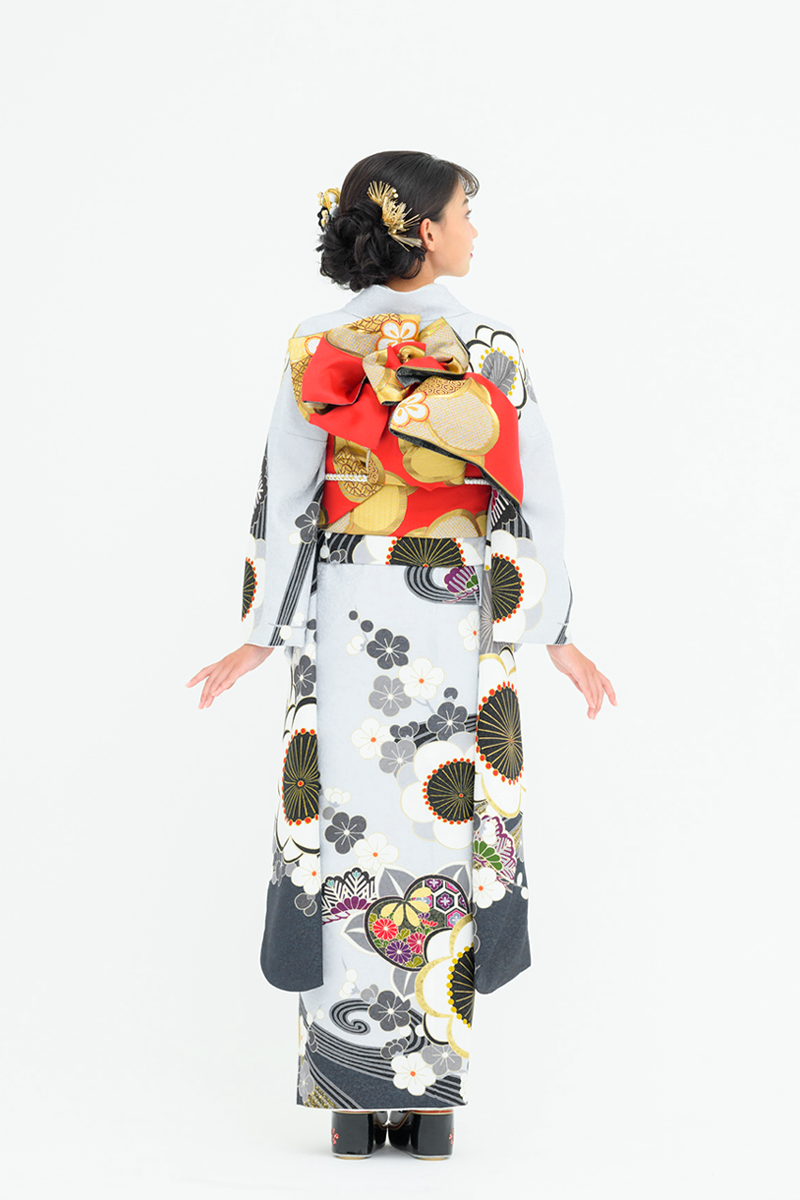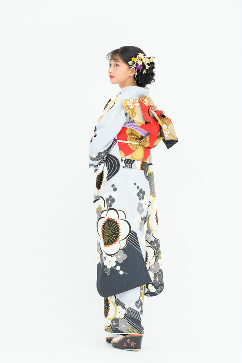 モノトーンの梅柄とビビットな小物合わせがひときわ個性的