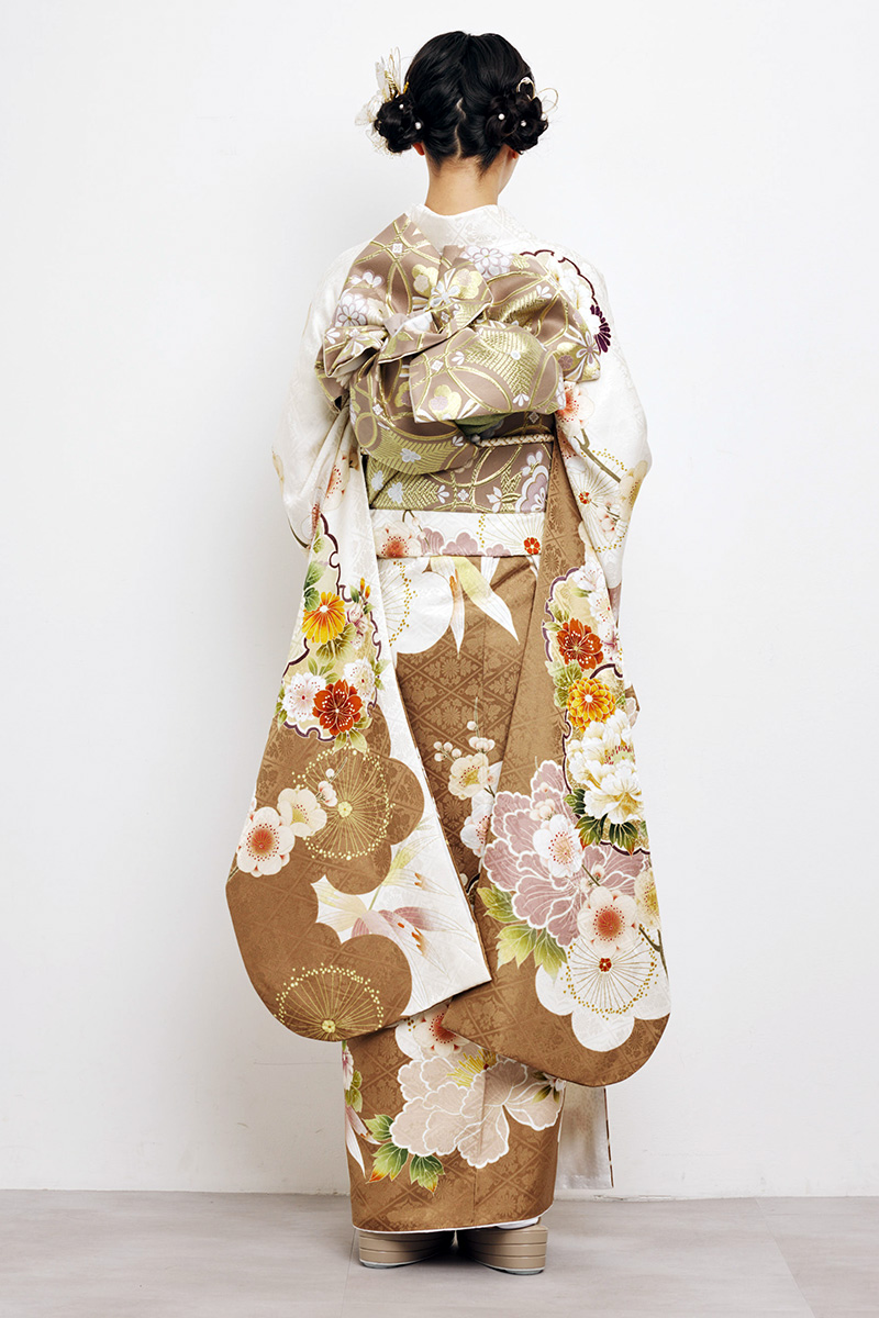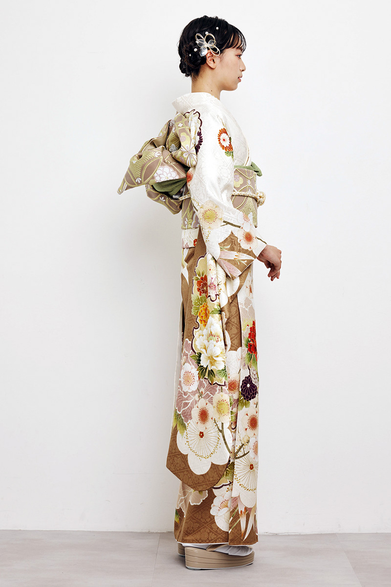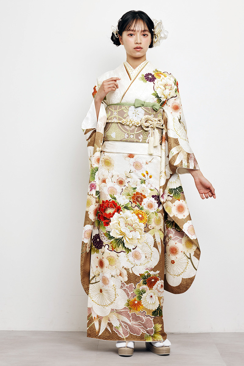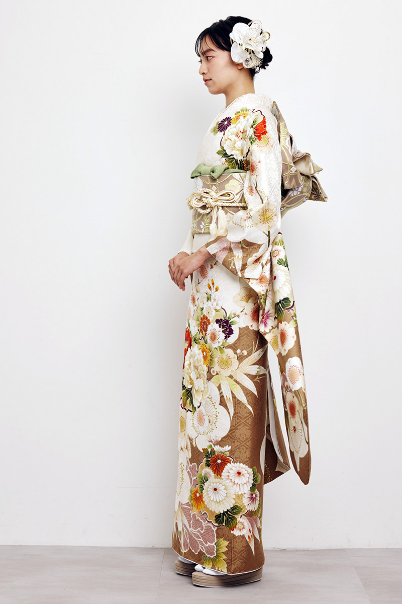 清楚な白地に上品な茶色が彩りを添え、牡丹や菊の華やかな花柄が美しく映える振袖。大人の女性らしい気品と優雅さを引き立て、特別な日を華やかに彩ります。華やかさと落ち着きを併せ持つ一着です。