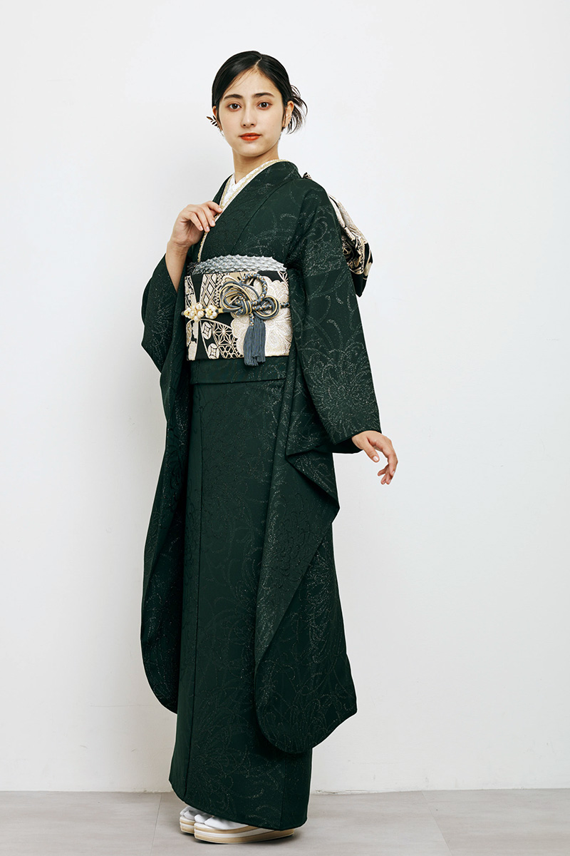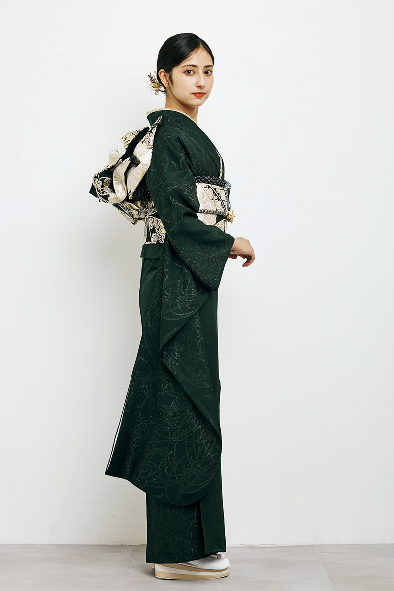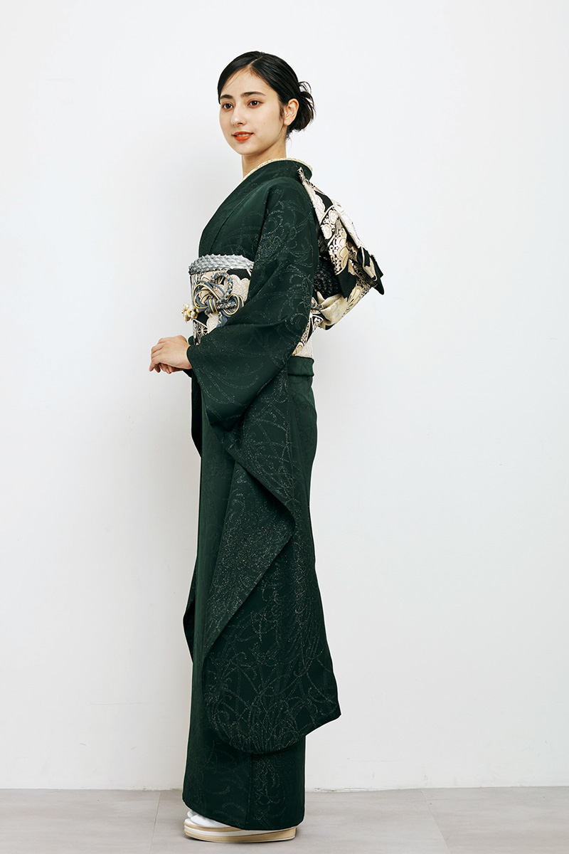 深緑の落ち着いた色合いが大人の品格を引き立てるシックな振袖。控えめなデザインが洗練された雰囲気を醸し出し、特別な日を上品に彩ります。エレガントで華やかさも兼ね備えた一着です。