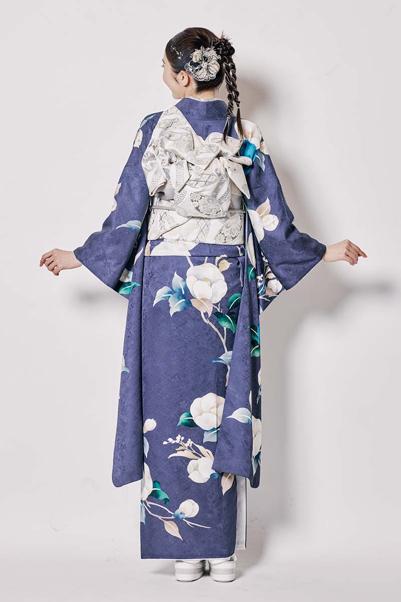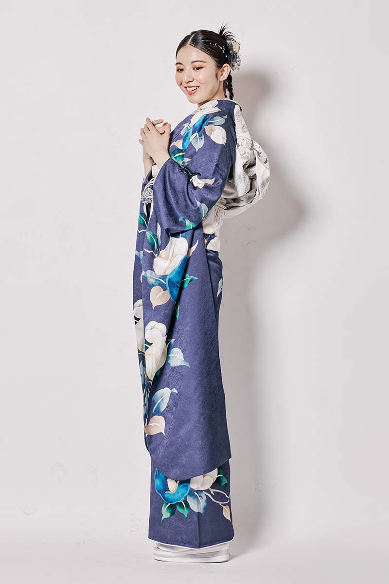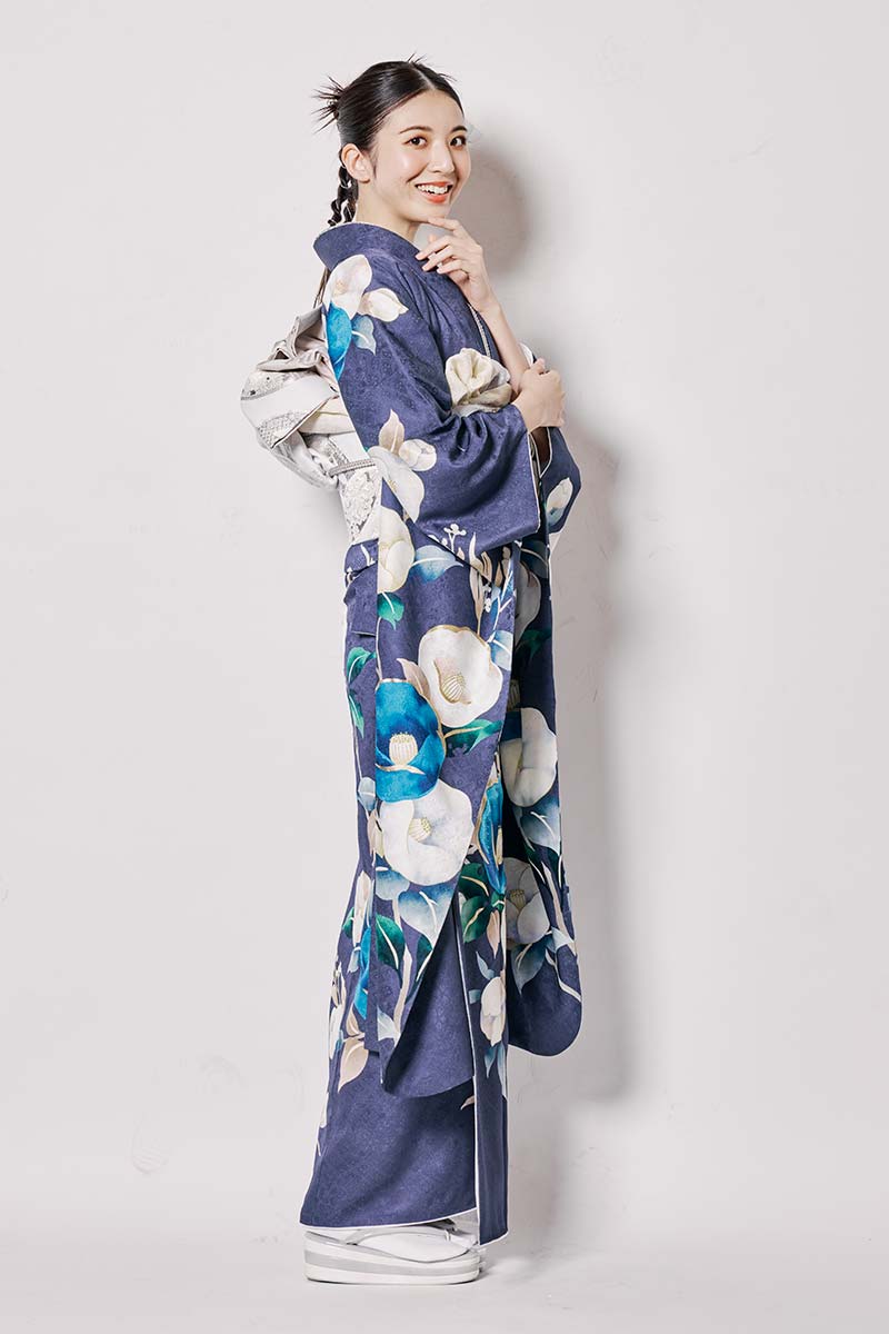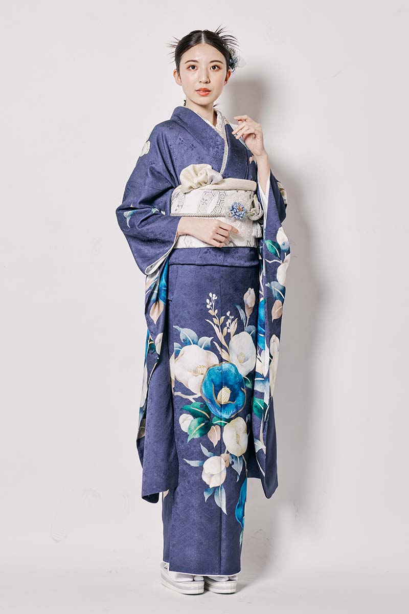 深紺の地に鮮やかな青い花が美しく映える振袖です。白と銀の帯が上品なアクセントとなり、全体にエレガントな雰囲気を添えます。大人の洗練された華やかさと気品を引き立て、特別な日を華やかに彩る一枚です。