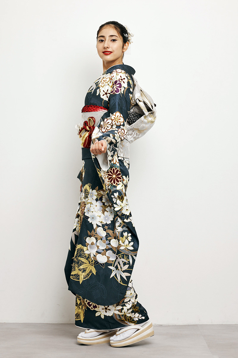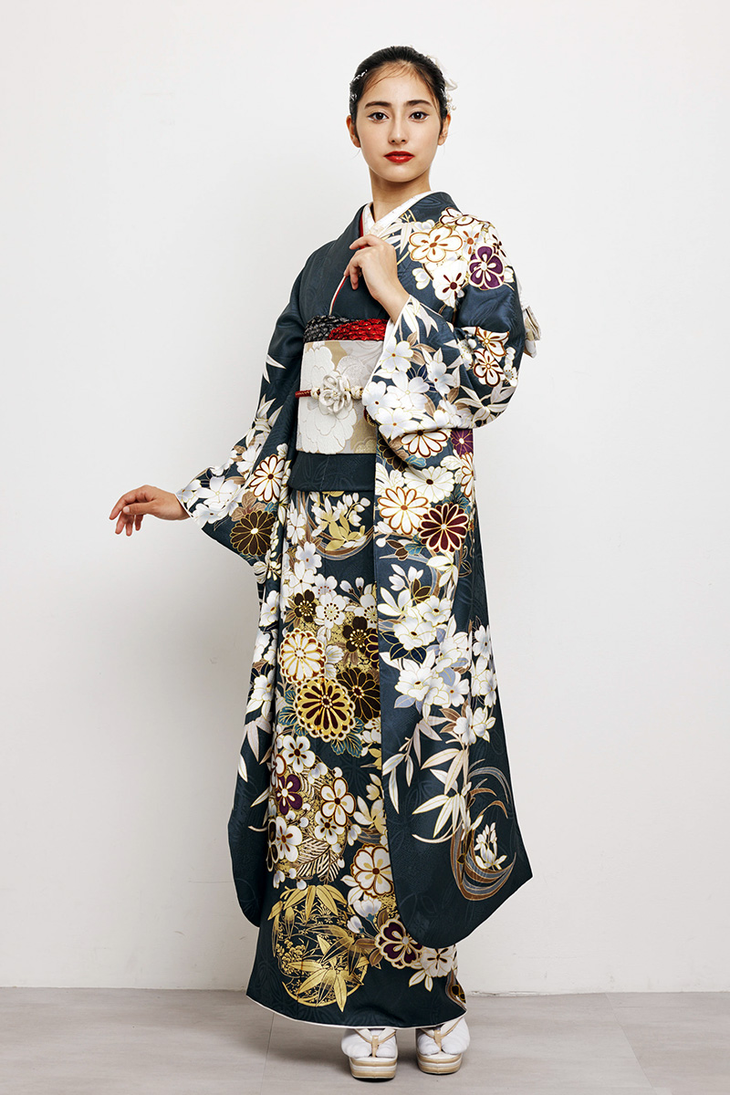 深緑の上品な色合いに、金と白の華やかな花柄が際立つ振袖。大人の洗練された雰囲気を引き立て、特別な日を華麗に彩ります。気品と華やかさを兼ね備えた一着です。