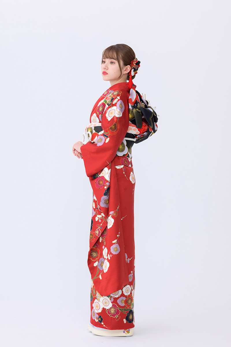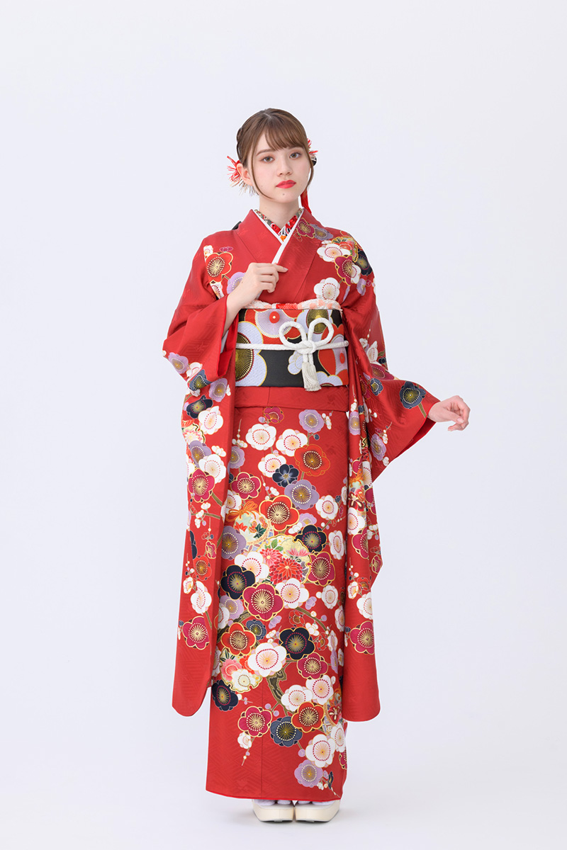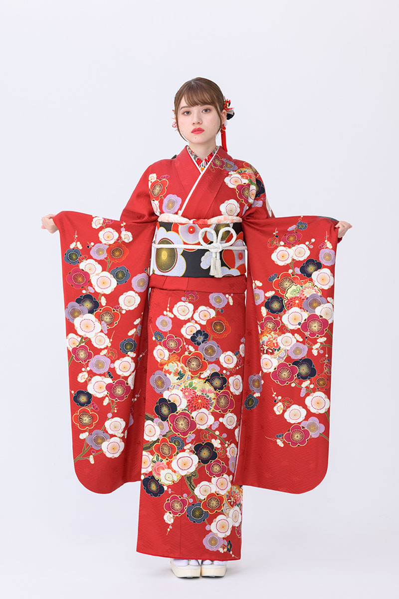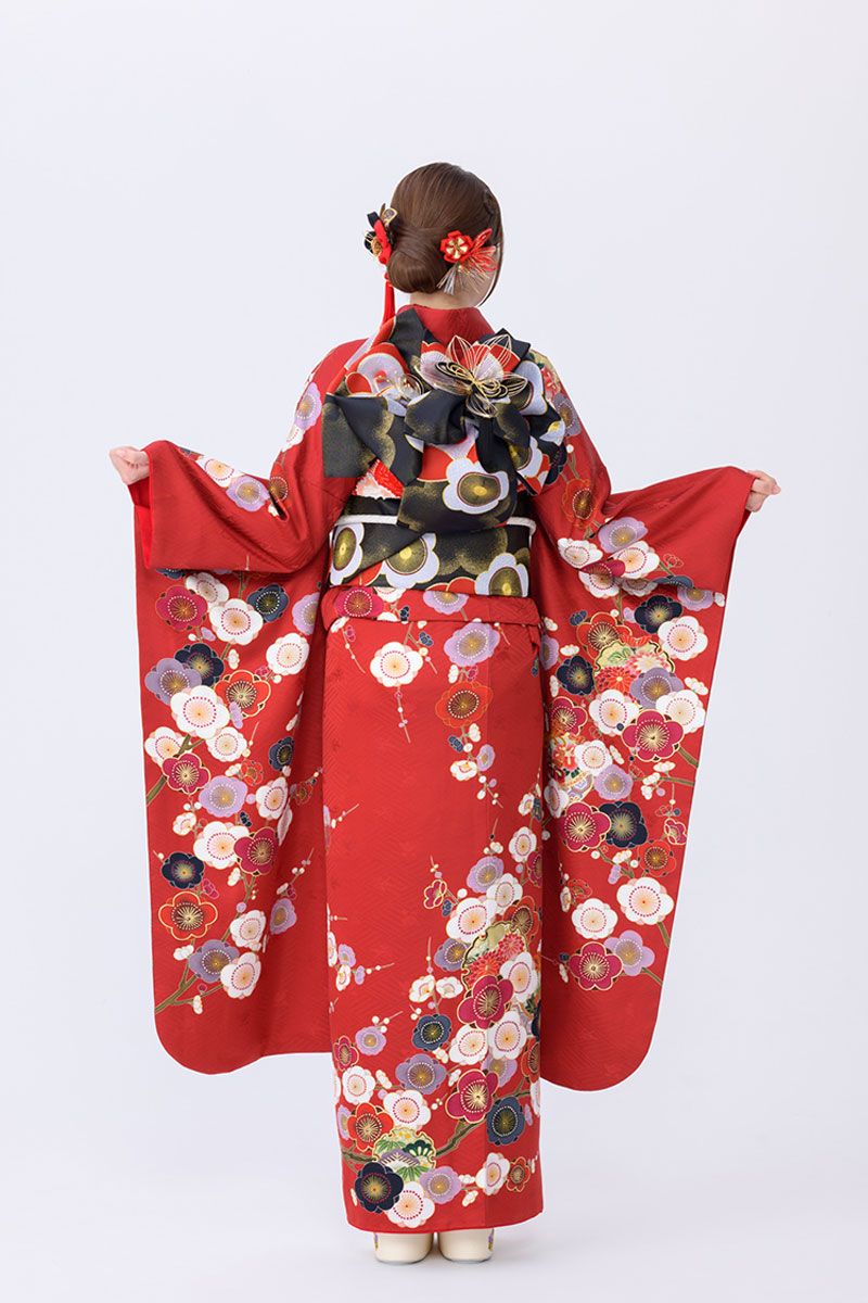赤地に梅の花を散りばめ薫りたつ艶やかさ