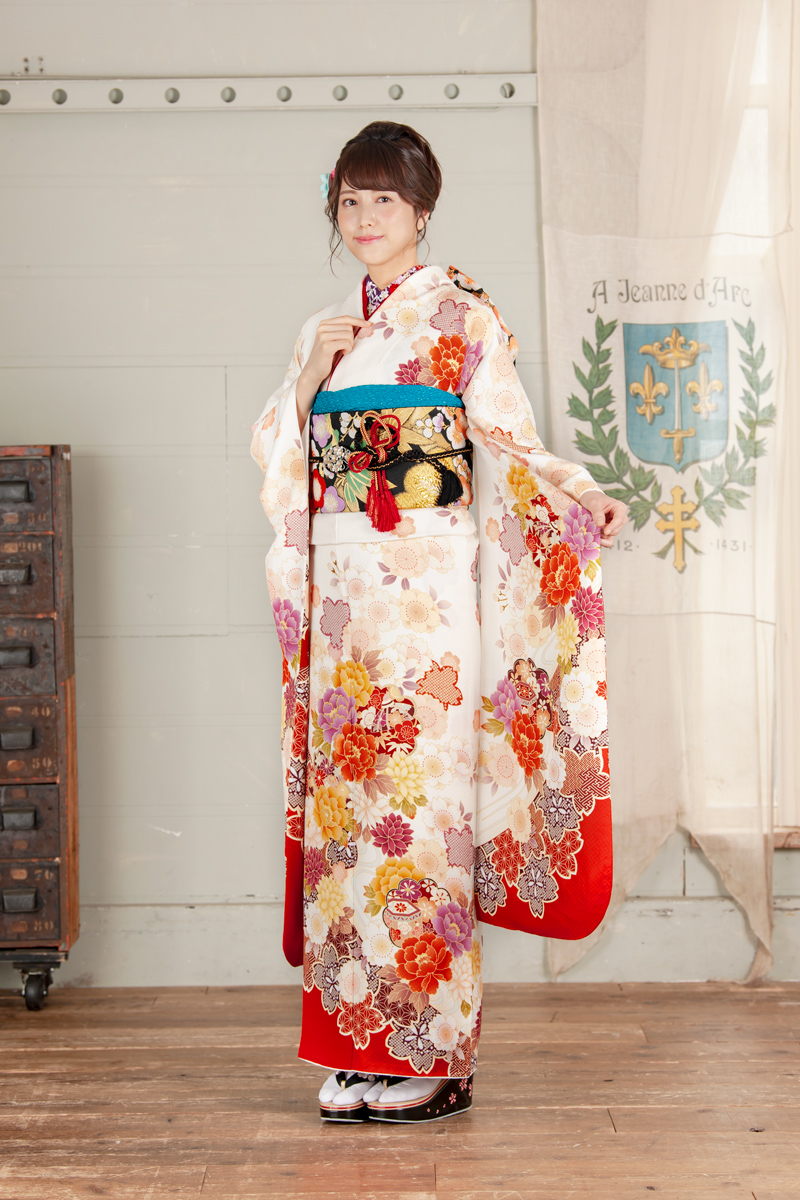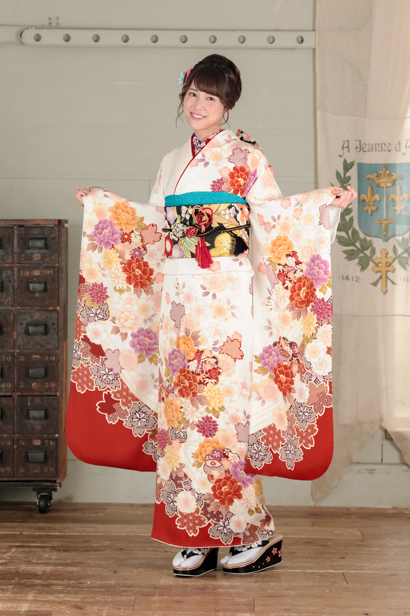 【まるやま・京彩グループオリジナル振袖】★最新作振袖★ 紅白地にビビッドな大輪の牡丹と桜をあしらいました。 すっきり清楚でクラシックな中にも現代的な華やかさが光る振袖。 2018年2月号 月刊B.L.T で、乃木坂46白石麻衣さんが着用。