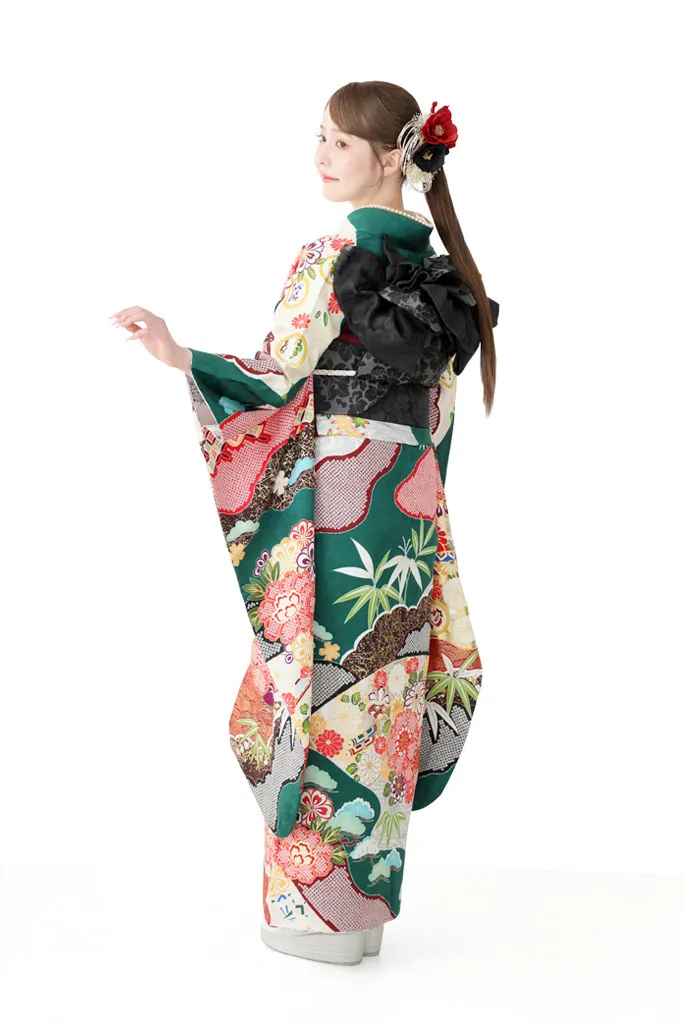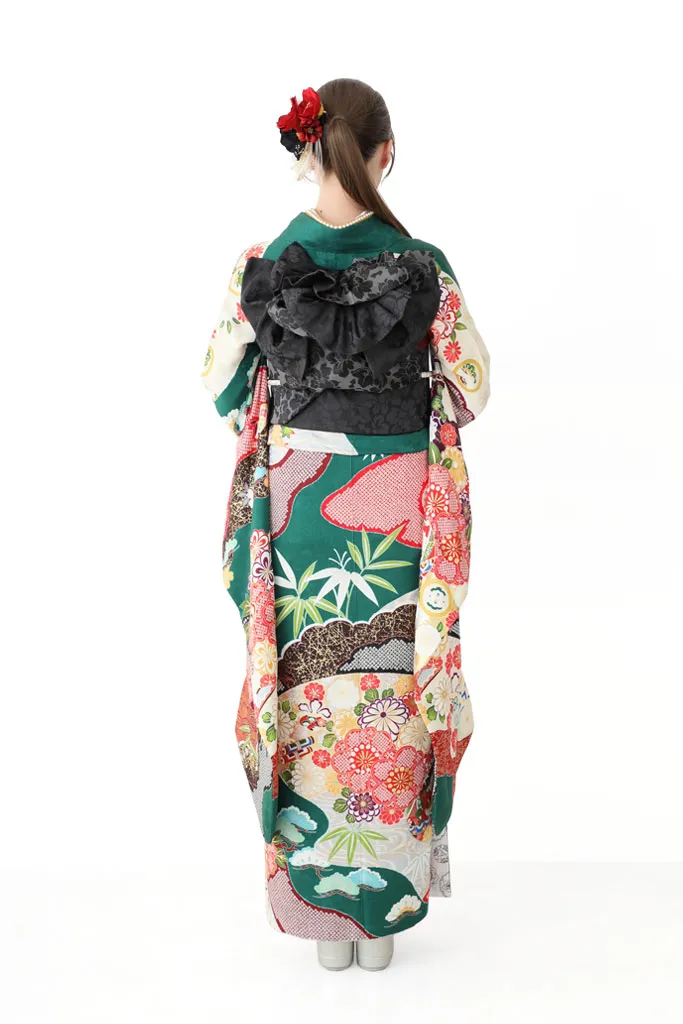 鮮やかな緑色に赤・白を基調とした花々が美しく華やかな一枚。