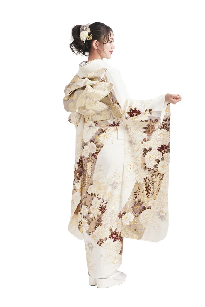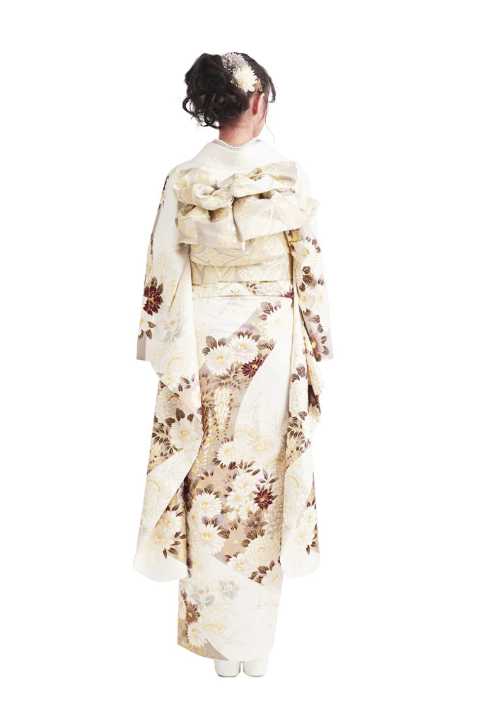人気の白地×白い花で色味を抑えるとアンニュイな装いに。立体的に描かれた重なり合う大輪の菊で可憐さも演出。