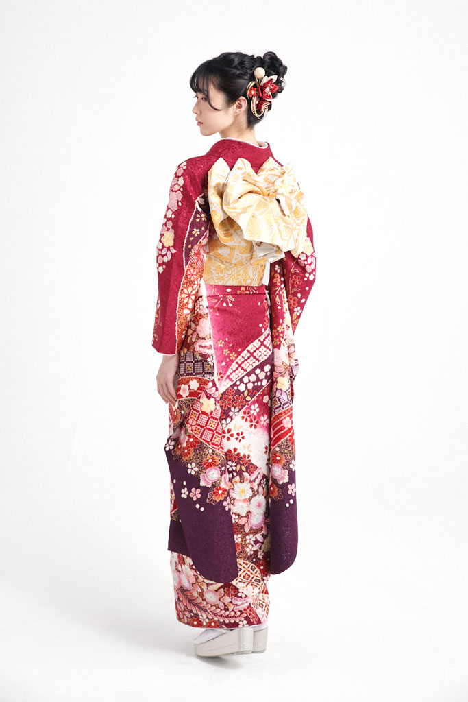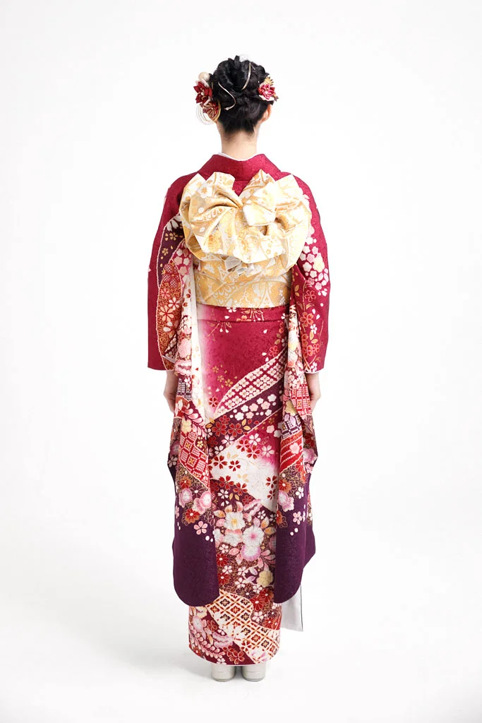 《オンディーヌオリジナル振袖》 王道の真紅の振袖に、辻が花の繊細な刺繍が織り成す華やかさ。伝統美を引き立て、特別な瞬間を彩る。