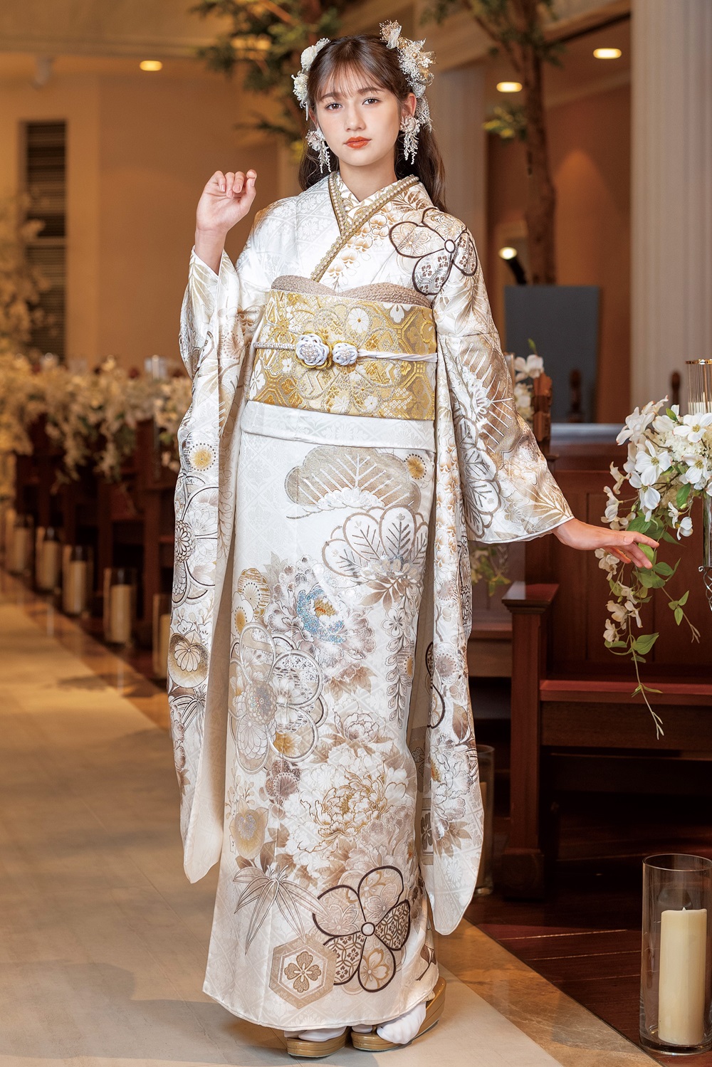 白・シルバー・ゴールドを基調とし、他の色味を抑えた振袖 上品で清楚な一枚