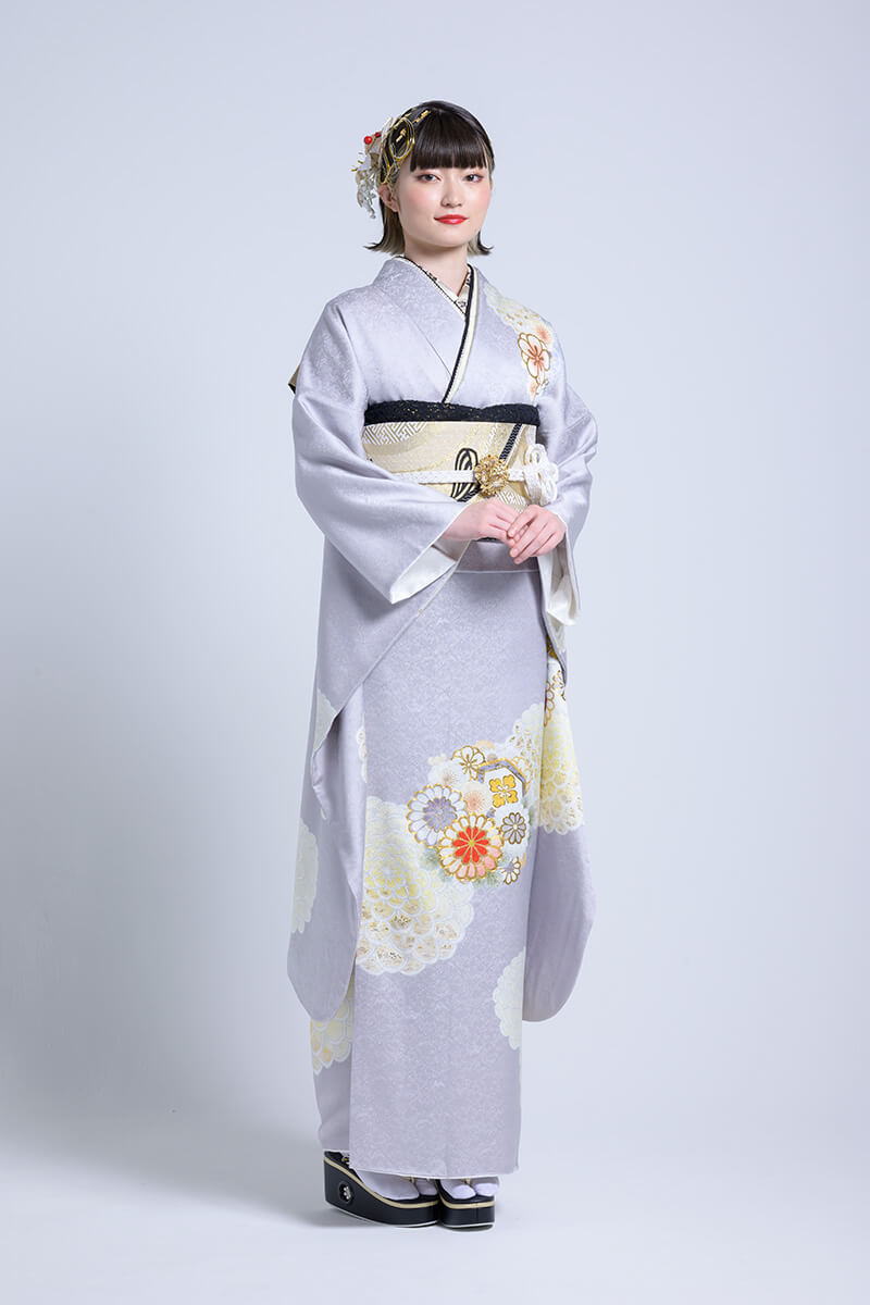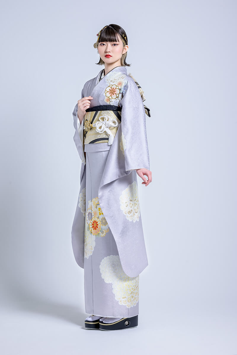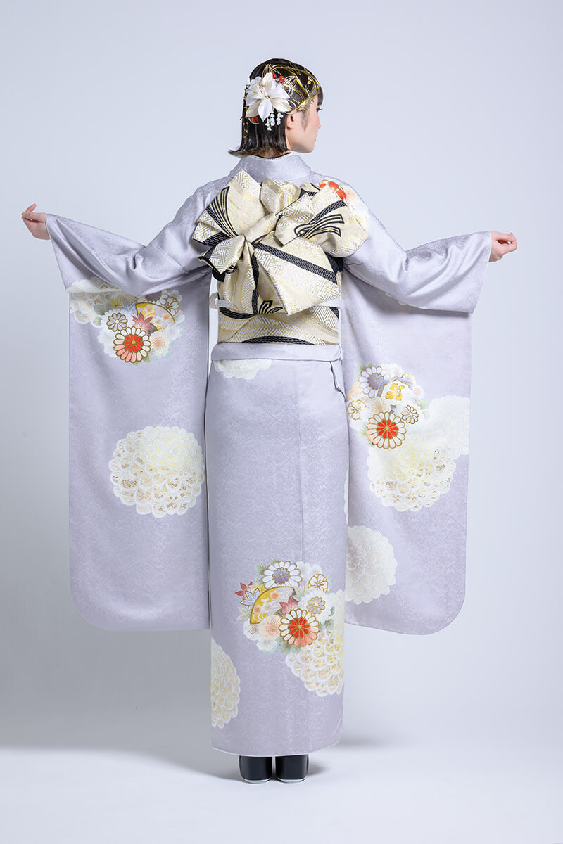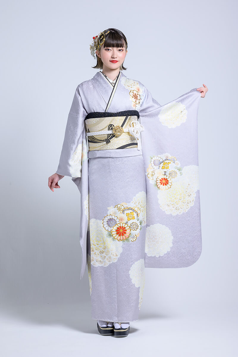 - 【MK-1309】鼠色の地に白い和花柄を合わせた振袖