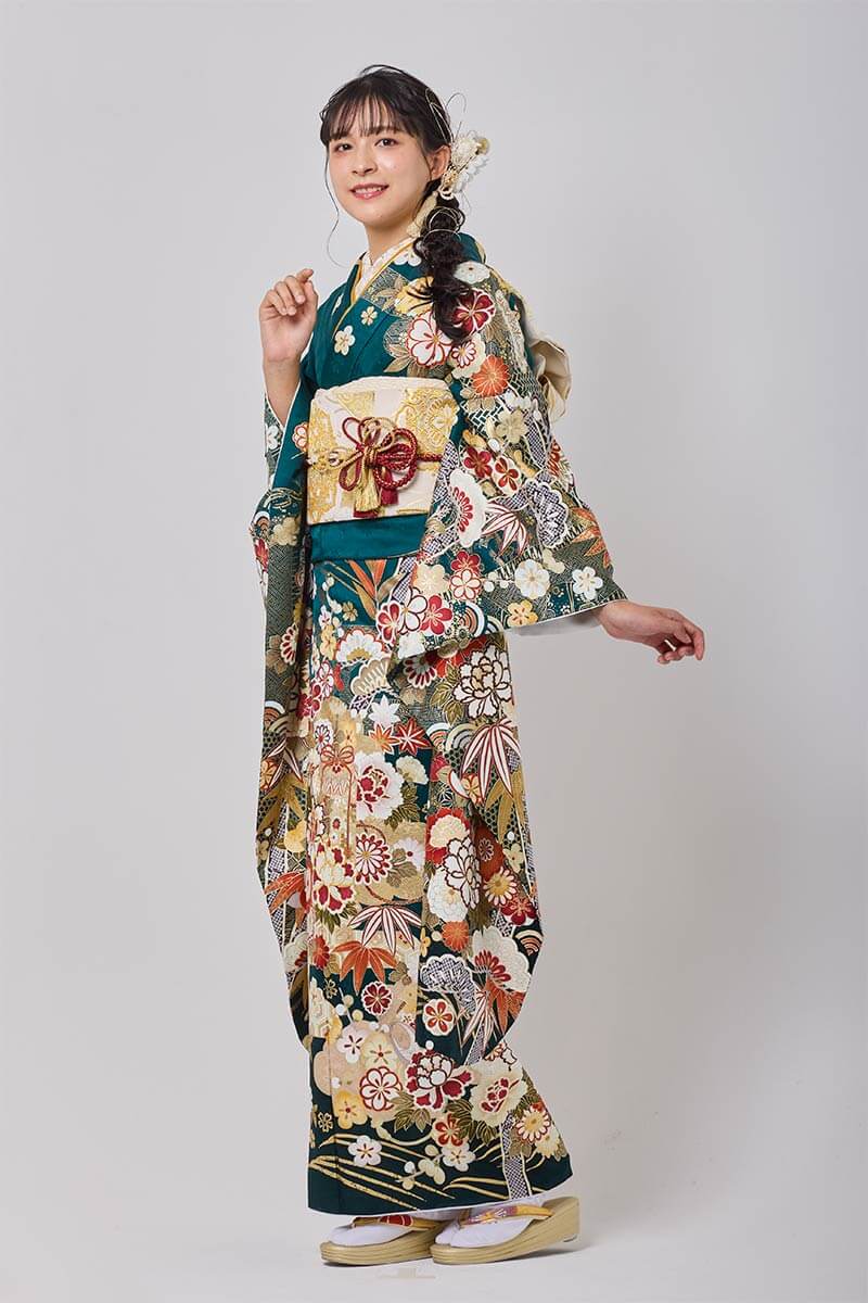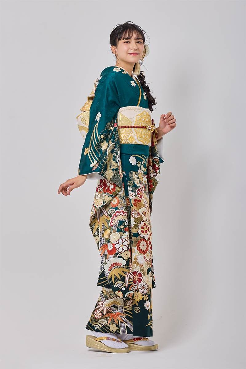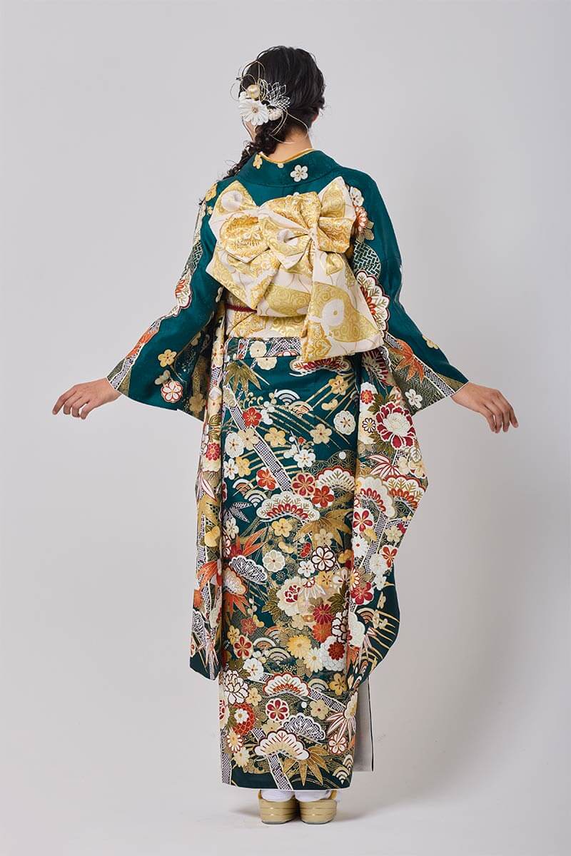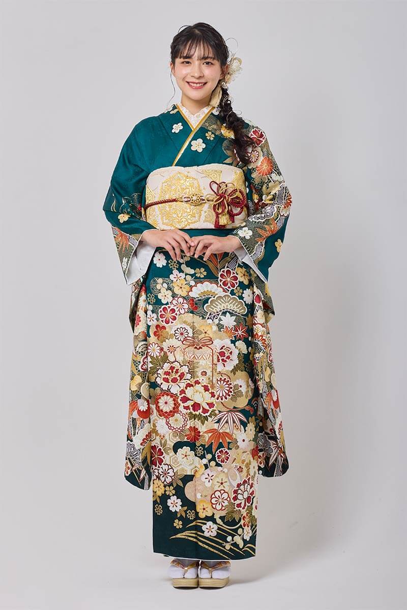 【まるやま・京彩グループオリジナル振袖】 深い緑が魅せる古典的柄が鮮やかな振袖。上品さと美しさを感じられる1枚です。
