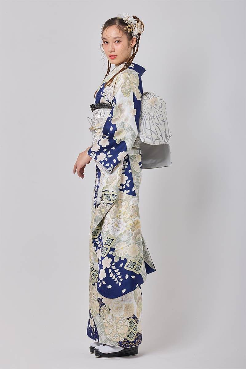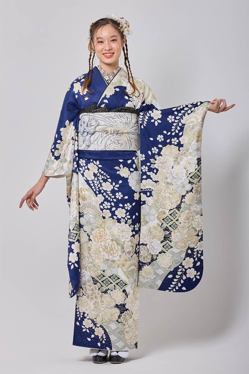 【まるやま・京彩グループオリジナル振袖】 深紺に漂う大輪の白花を散りばめた現代的な華やかさが光る振袖。