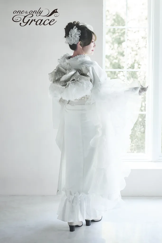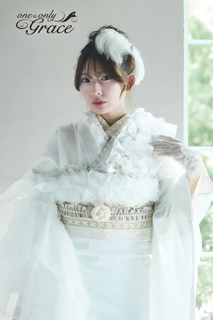 【オンディーヌオリジナル振袖】襟元のパールフリル、片袖の透明感あるフリル、そして裾の光沢サテンレースが織りなすロマンティックなデザイン。花嫁のような特別感と優雅な華やかさで、夢のような一日を演出。 《通常サイズ フリーサイズ》 ※特殊サイズにつきましては+30,000円追加料金が発生いたします。