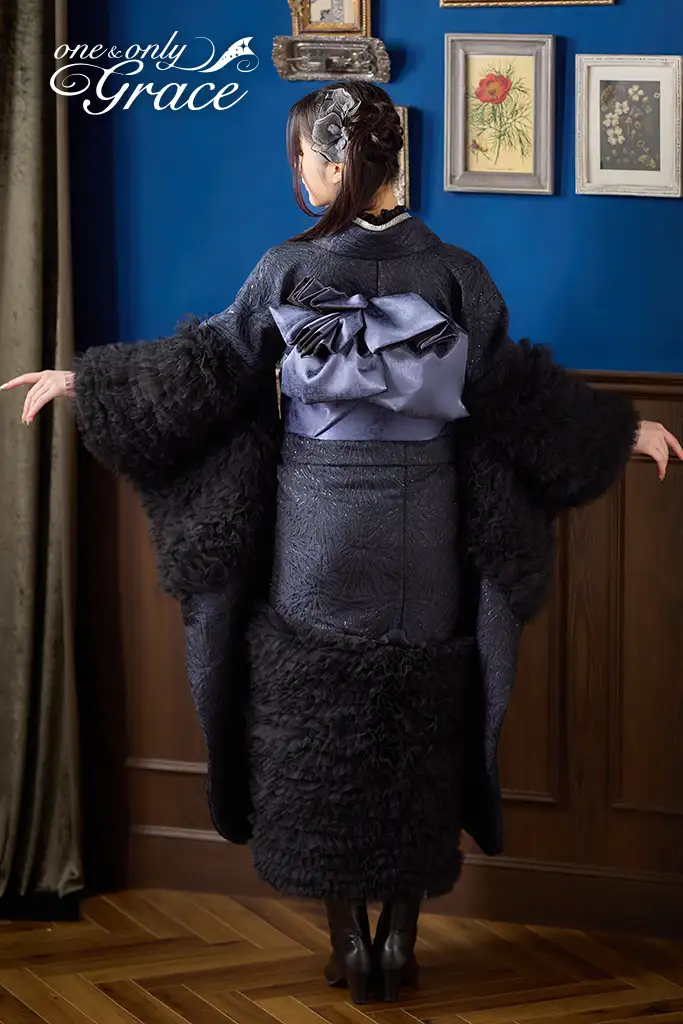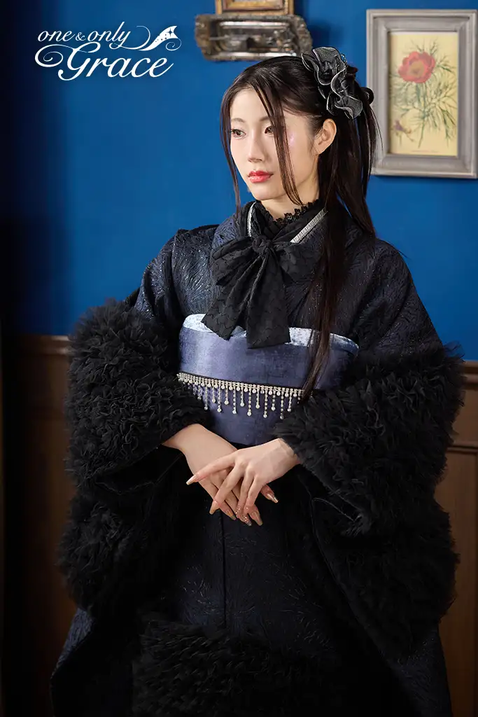 【オンディーヌオリジナル振袖】落ち着いた濃紺の地色に袖と裾にたっぷりとあしらわれた黒のフリルが、ドラマティックなボリューム感と華やかさを演出。シックでありながら大胆なデザインは甘すぎない大人の華やぎのある一着。 《通常サイズ フリーサイズ》 ※特殊サイズにつきましては+30,000円追加料金が発生いたします。