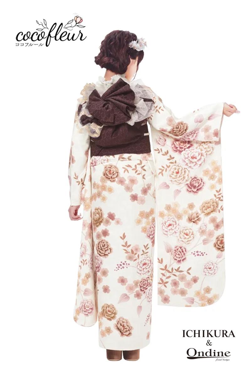 【ICHIKURA&オンディーヌ限定振袖】 オフホワイト地×ブラウンレース帯、リボンの帯締めを合わせてガーリーな雰囲気を演出