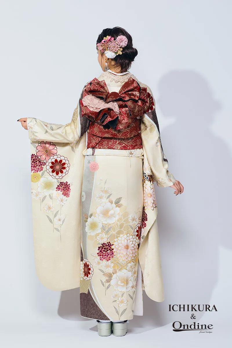 【ICHIKURA&オンディーヌ限定振袖】 優しいニュアンスカラーに咲く伝統の菊や牡丹。高貴な花菱模様が洗練された印象を後押し。