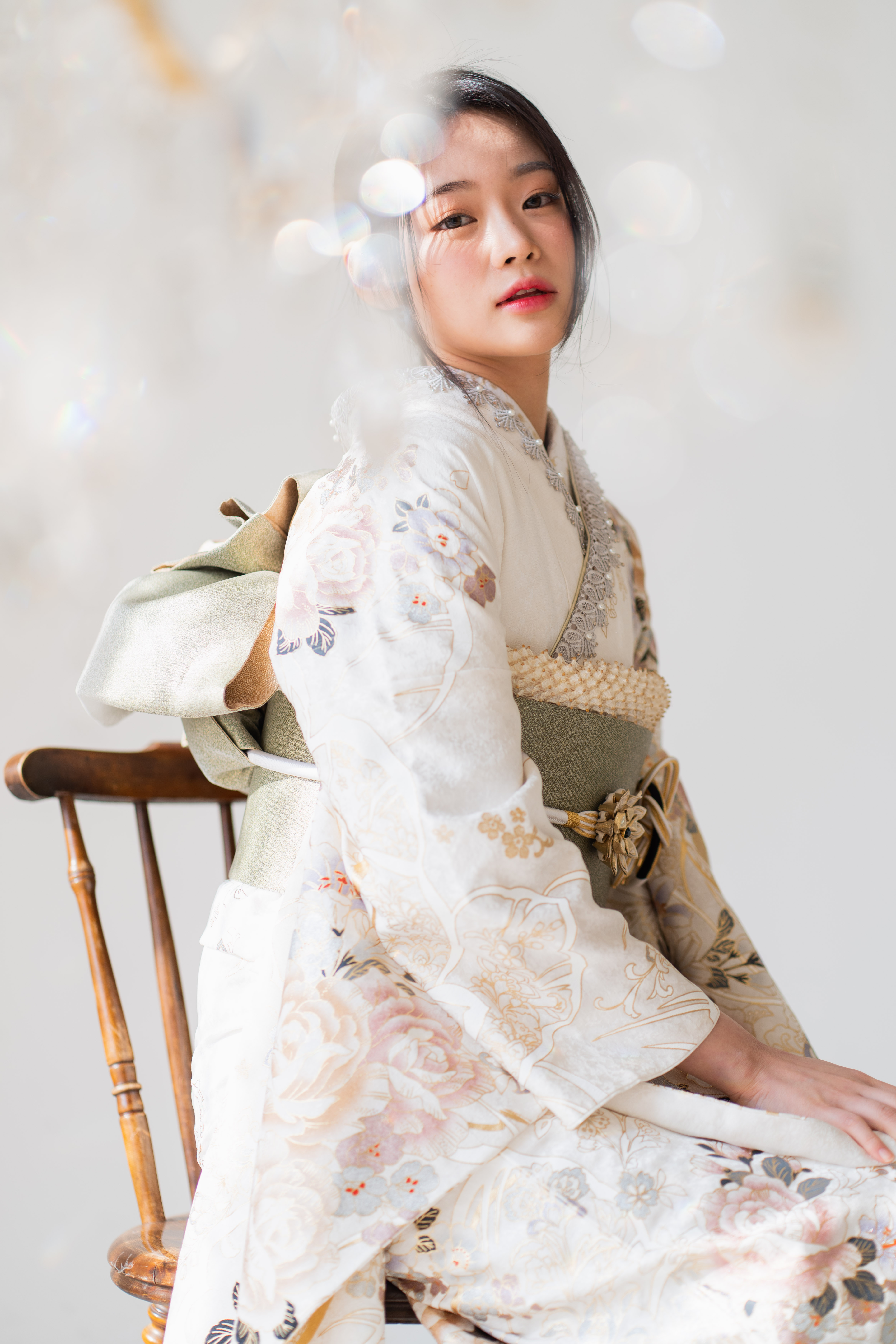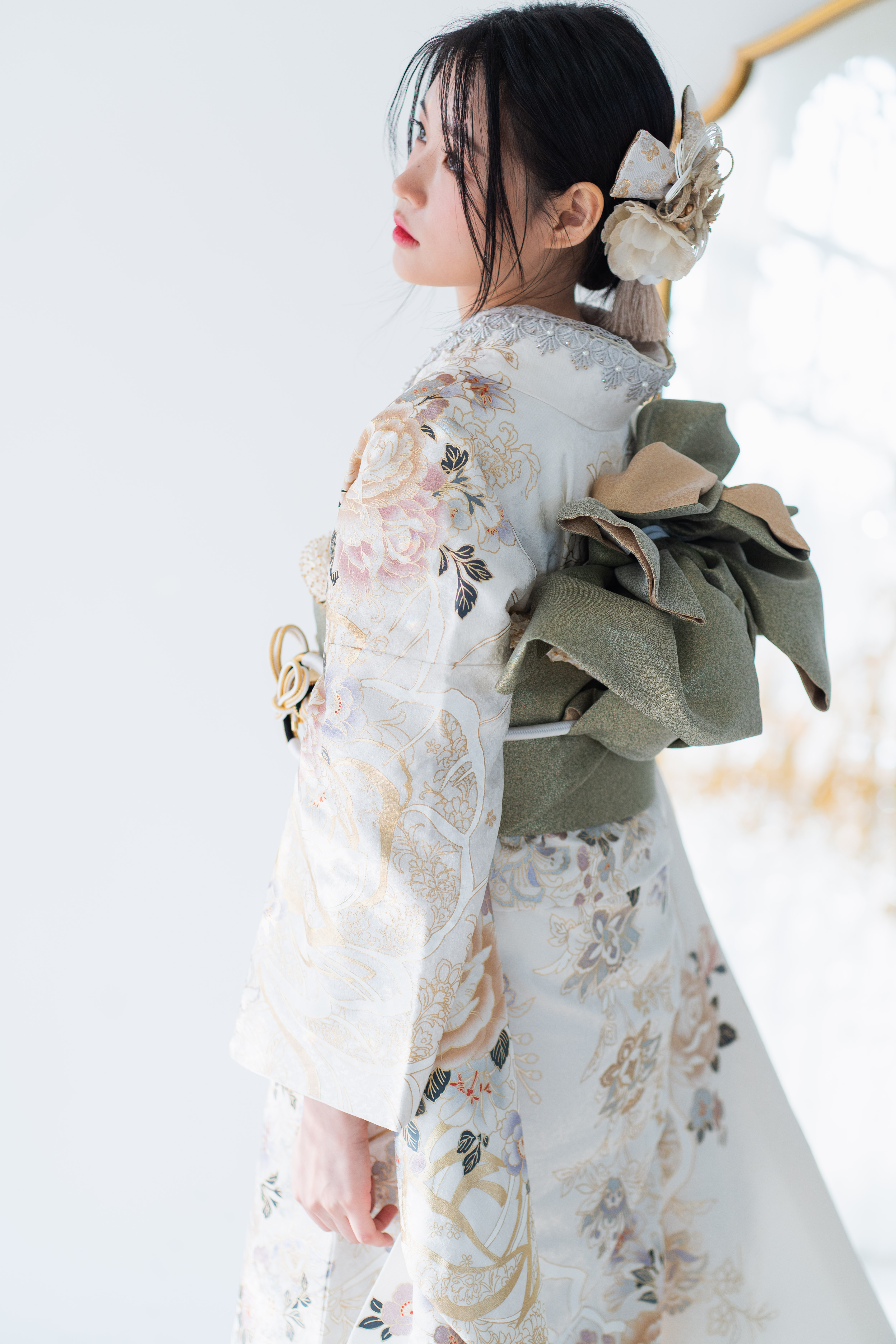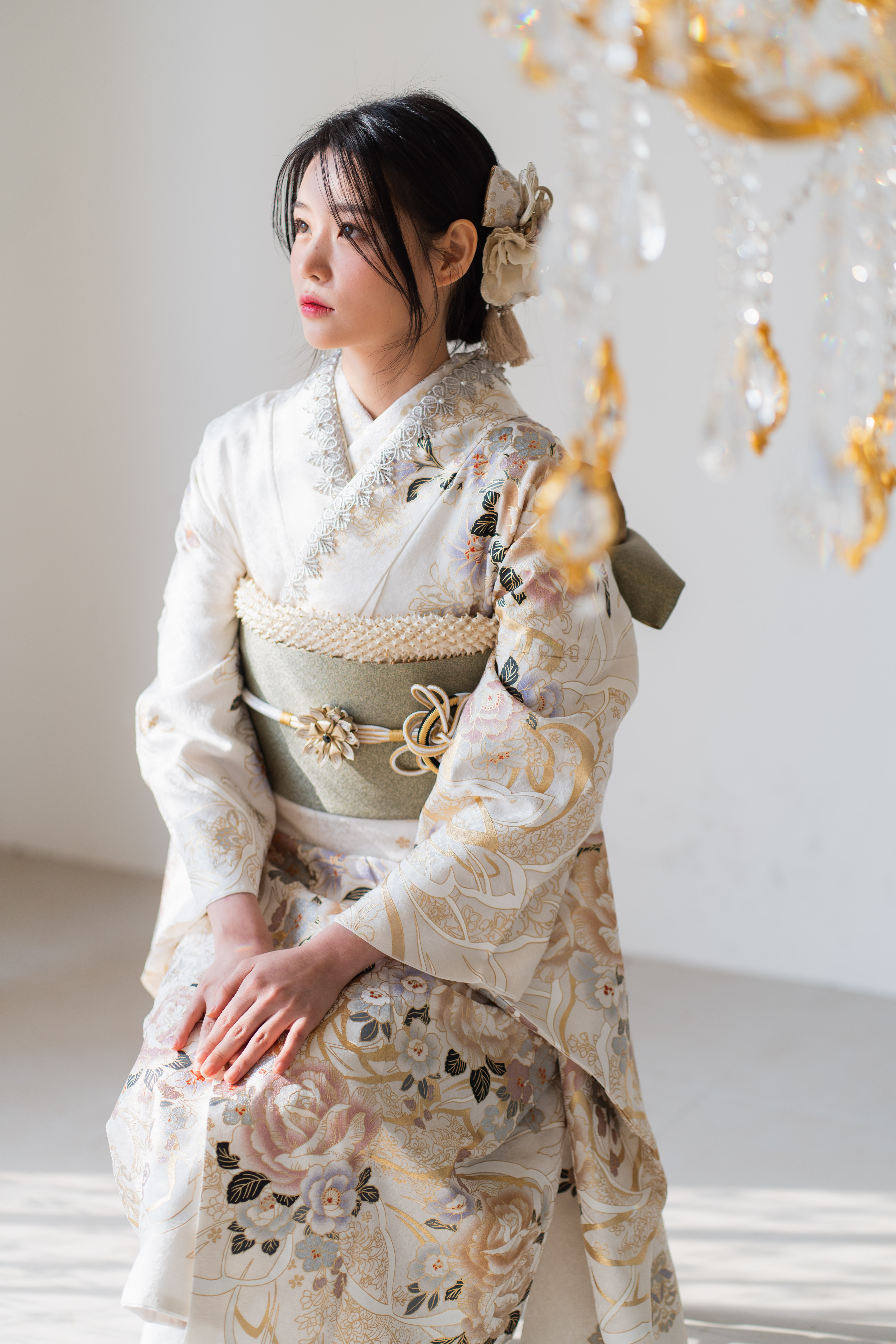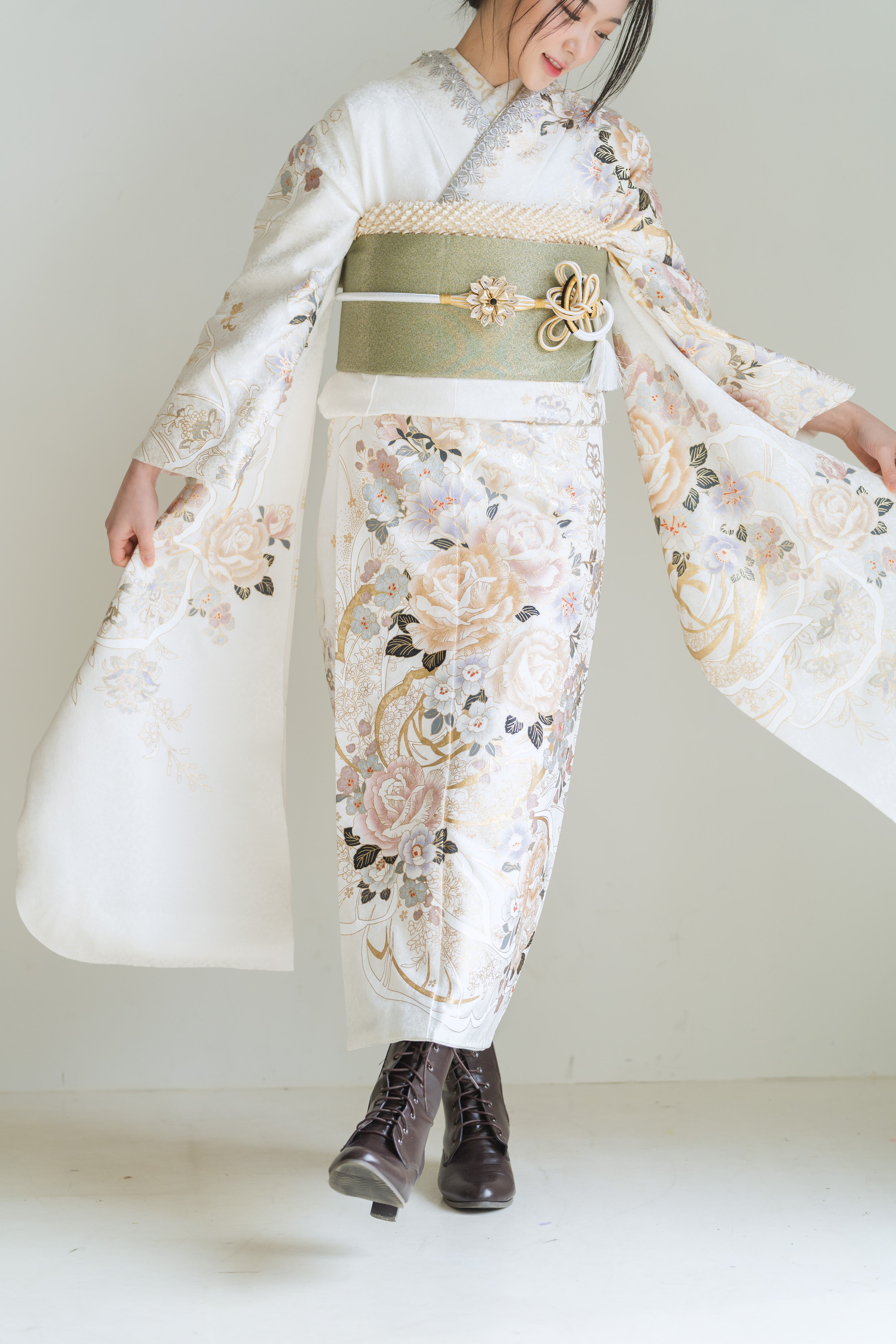 バラを中心に洋花をあしらったモダンな仕上がり。金彩加工を施し金、銀、パールで輝きを放ちます。見る人、着る人どちらも魅了する振袖です。【170㎝以上対応】