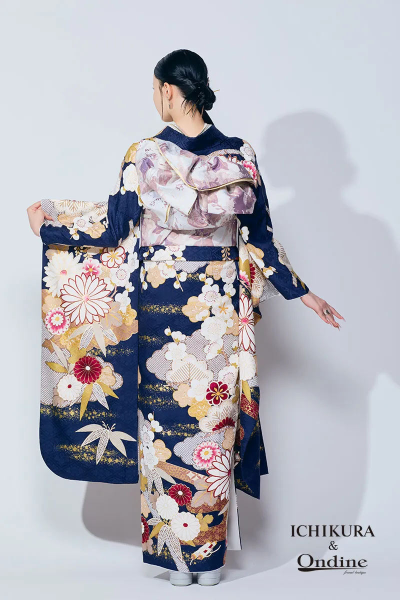 濃紺の地色が上質さを引き立て、金をあしらった菊や松の柄行きが古典の粋を感じさせる。格調高い魅力を放つ振袖。
