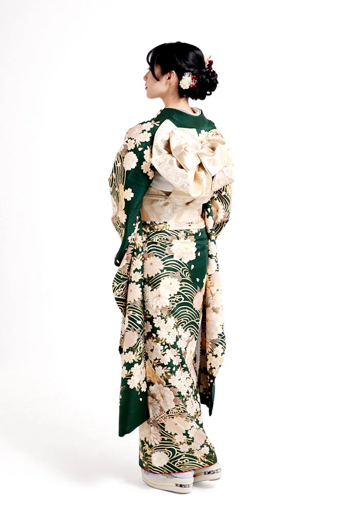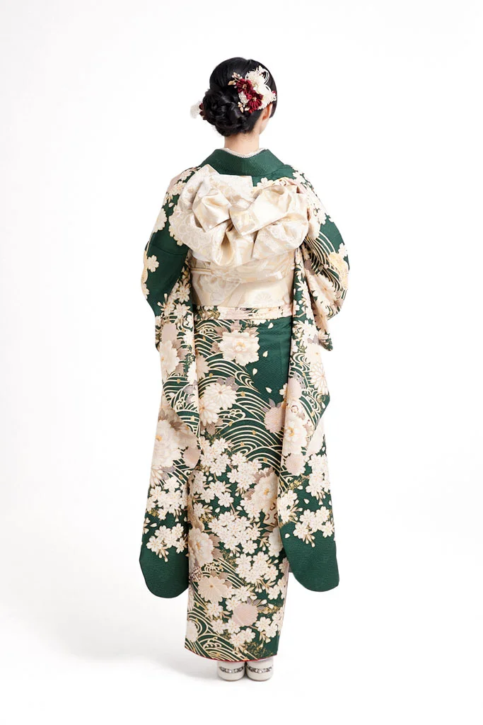 由緒正しい古典柄をおしゃれに着こなすなら深緑がおすすめ。咲き誇る乳白色の花々が優しくあなたを彩る。