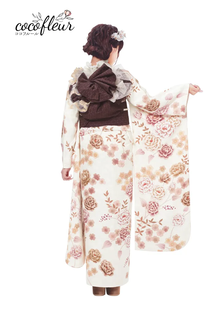 《オンディーヌオリジナル振袖》 オフホワイト地×ブラウンレース帯 リボンの帯締めで完成!ケーキのように重なる可愛さを味わって