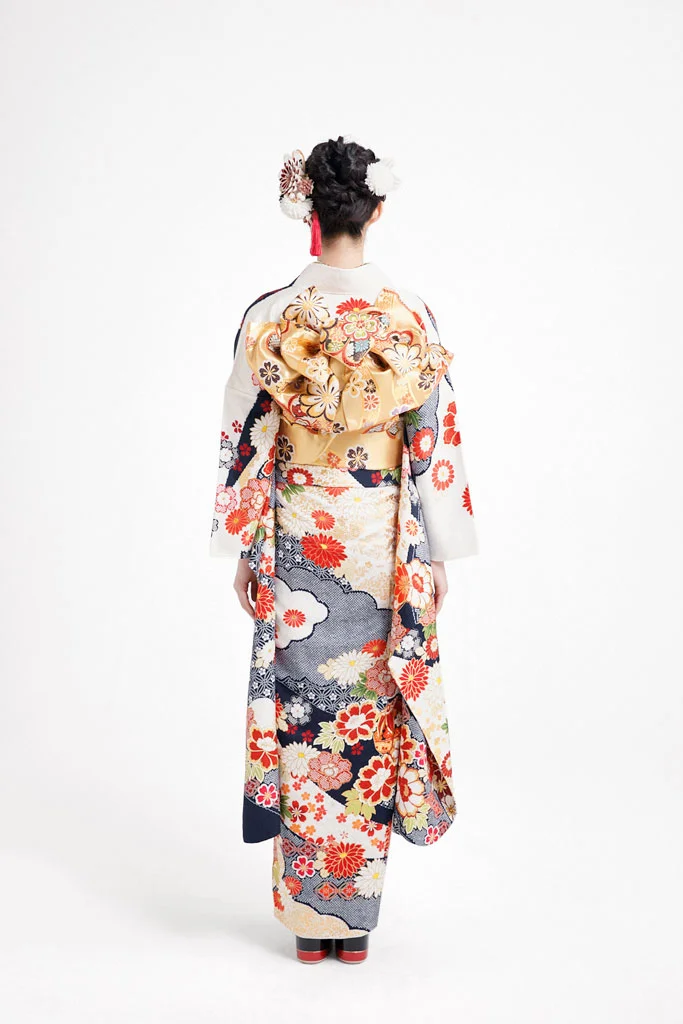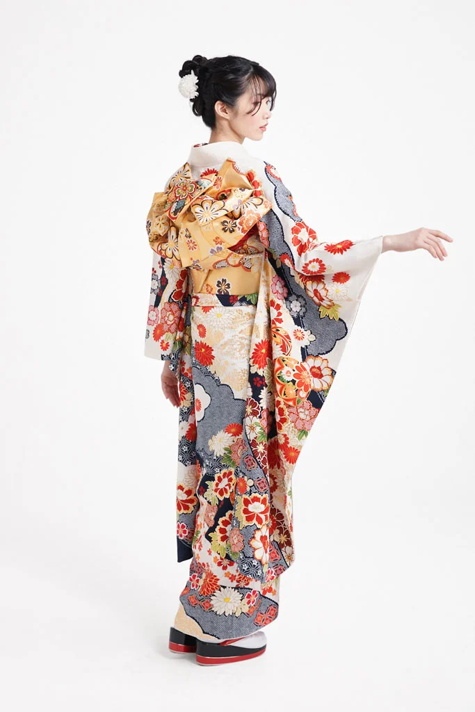 《オンディーヌオリジナル振袖》 鹿子柄に御所車や鞠が映える多色使いが楽しい振袖。カラフルな小物を合わせて、全身で華やかさを演出して。