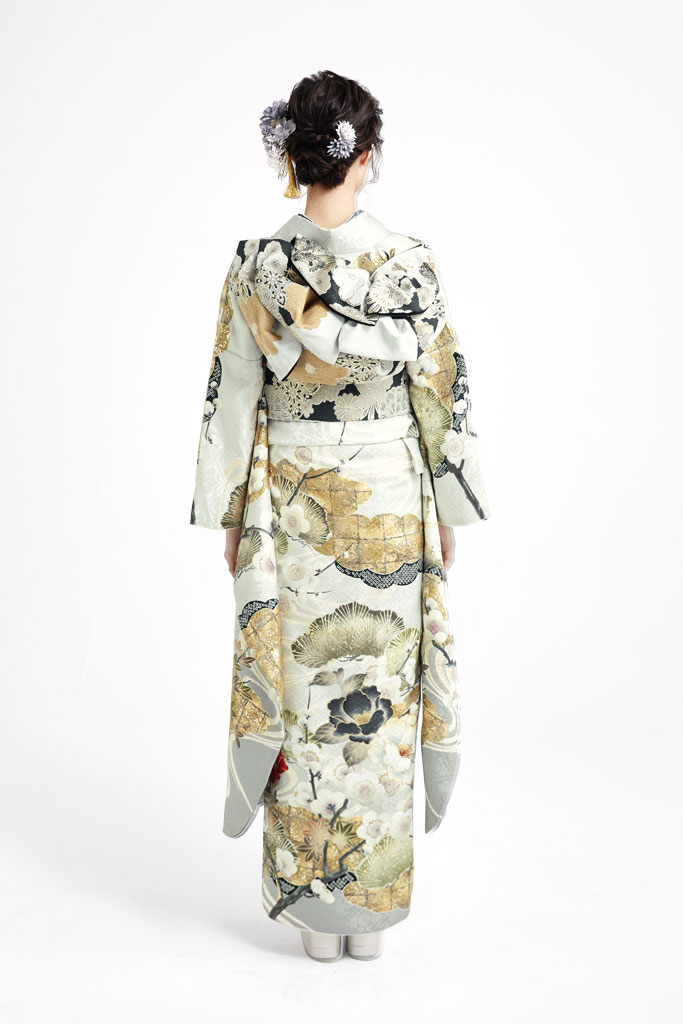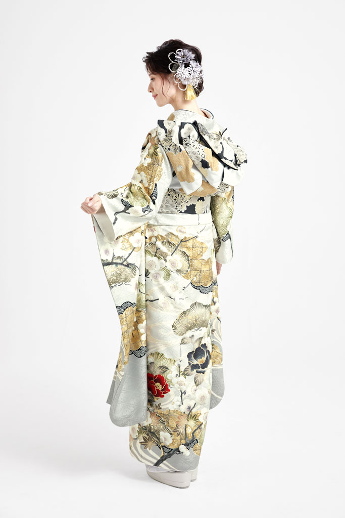 たゆたう流水に墨黒、白、赤の椿が映える大人ホワイトの振袖。袖に広がるライトグレーの色味がこなれ感を演出。