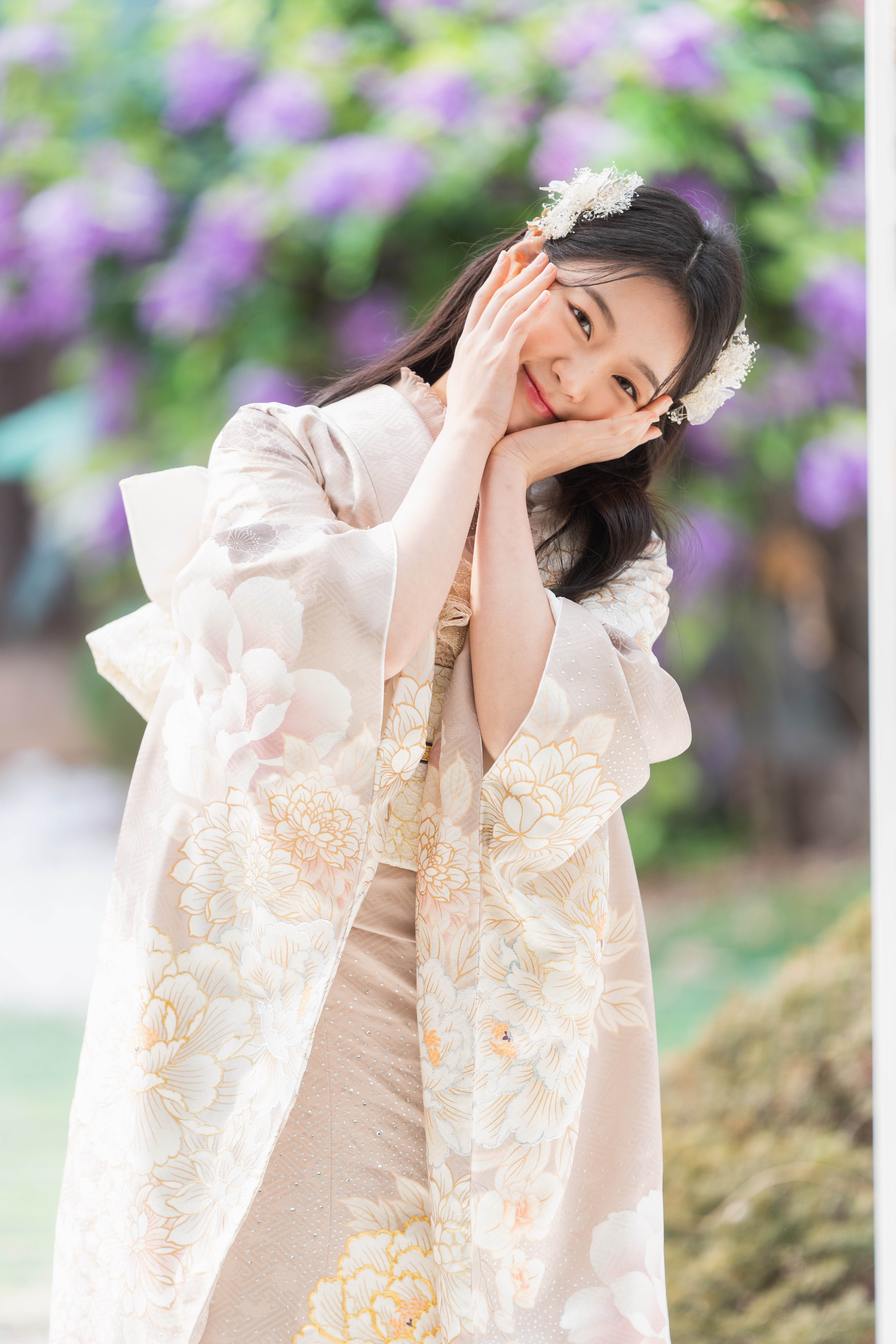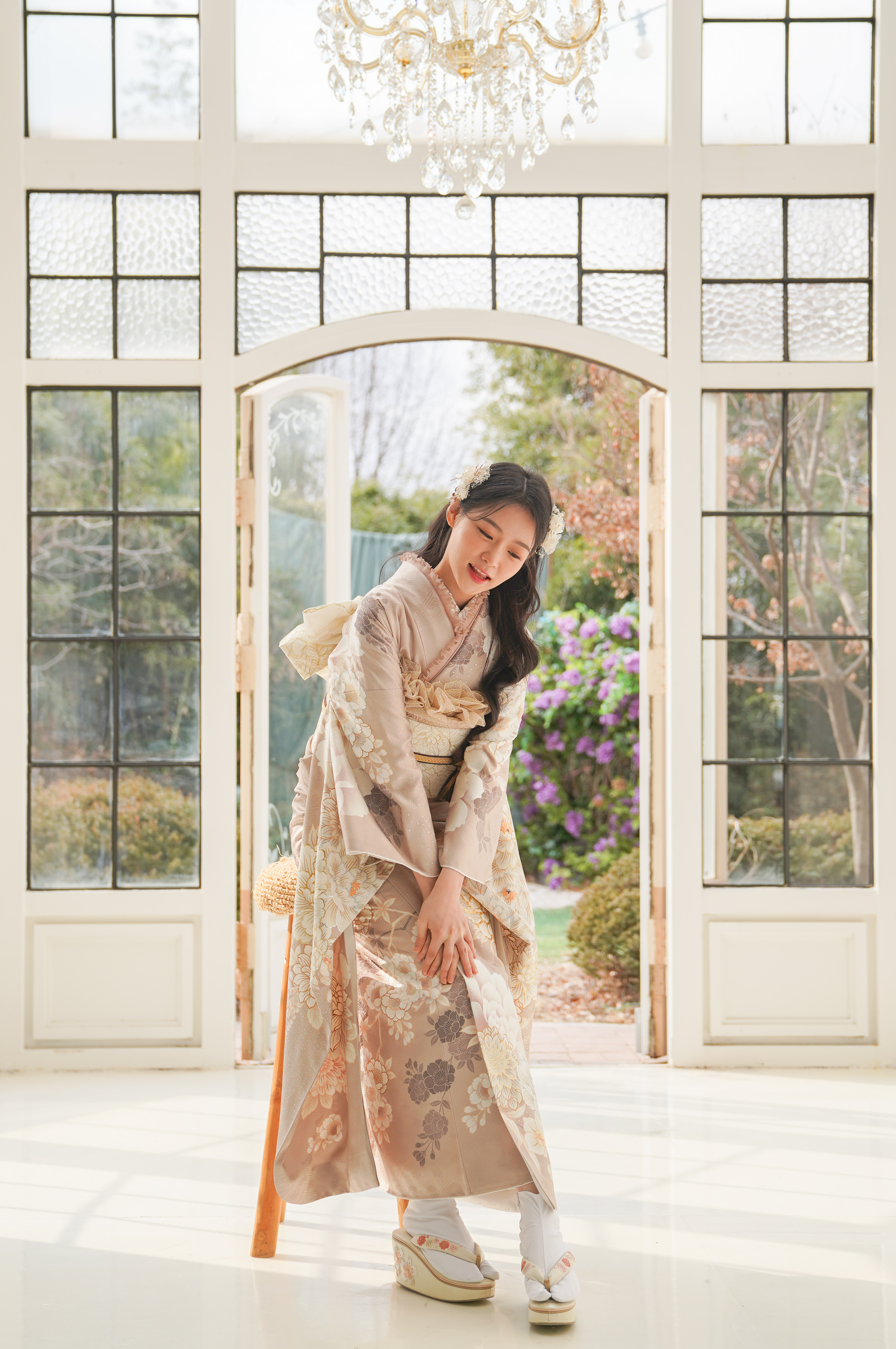 大柄な構図で白を基調とした花柄と モカベージュの地色がよくマッチした大人すっきりのカラーリングにラインストーンがきらめきます。