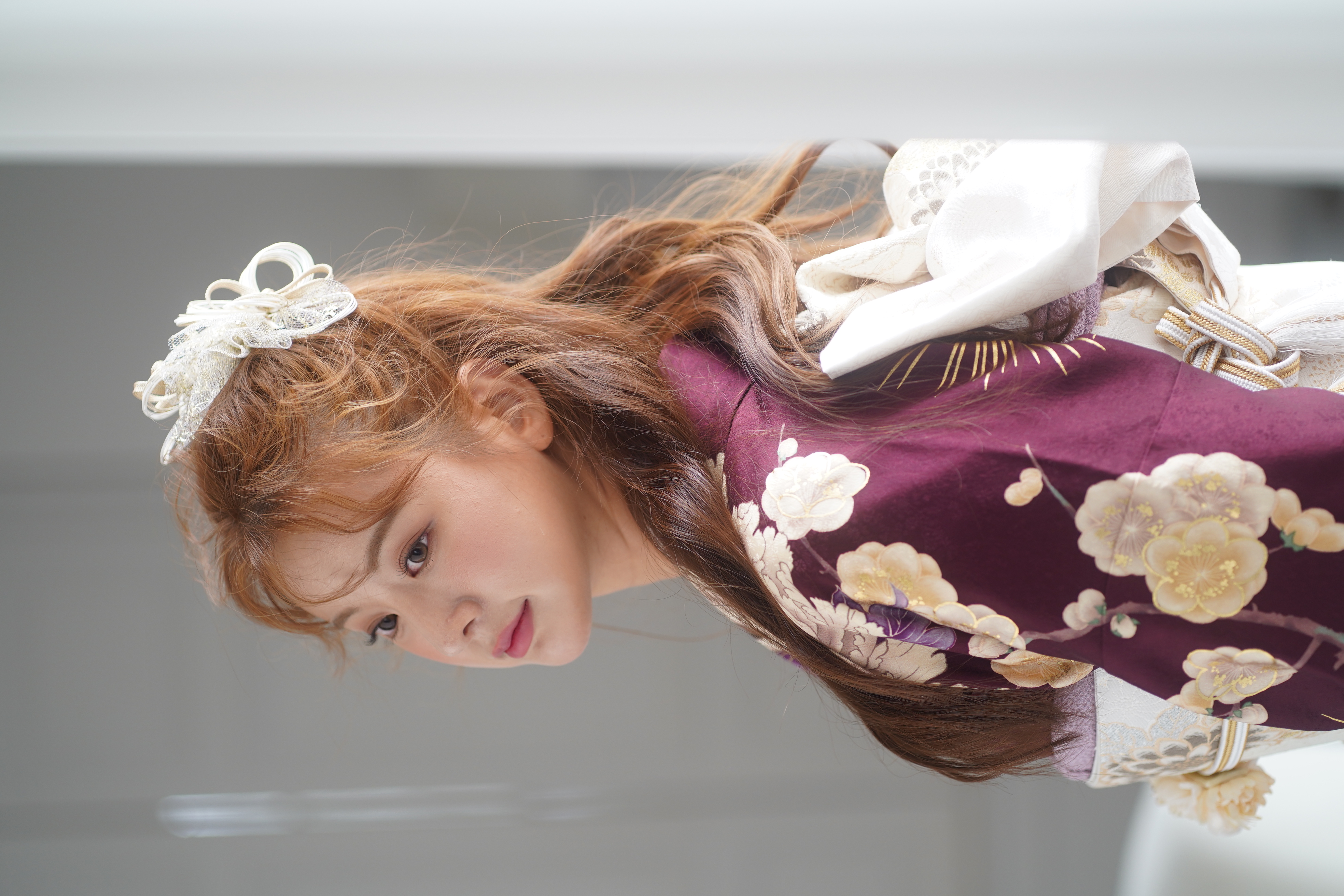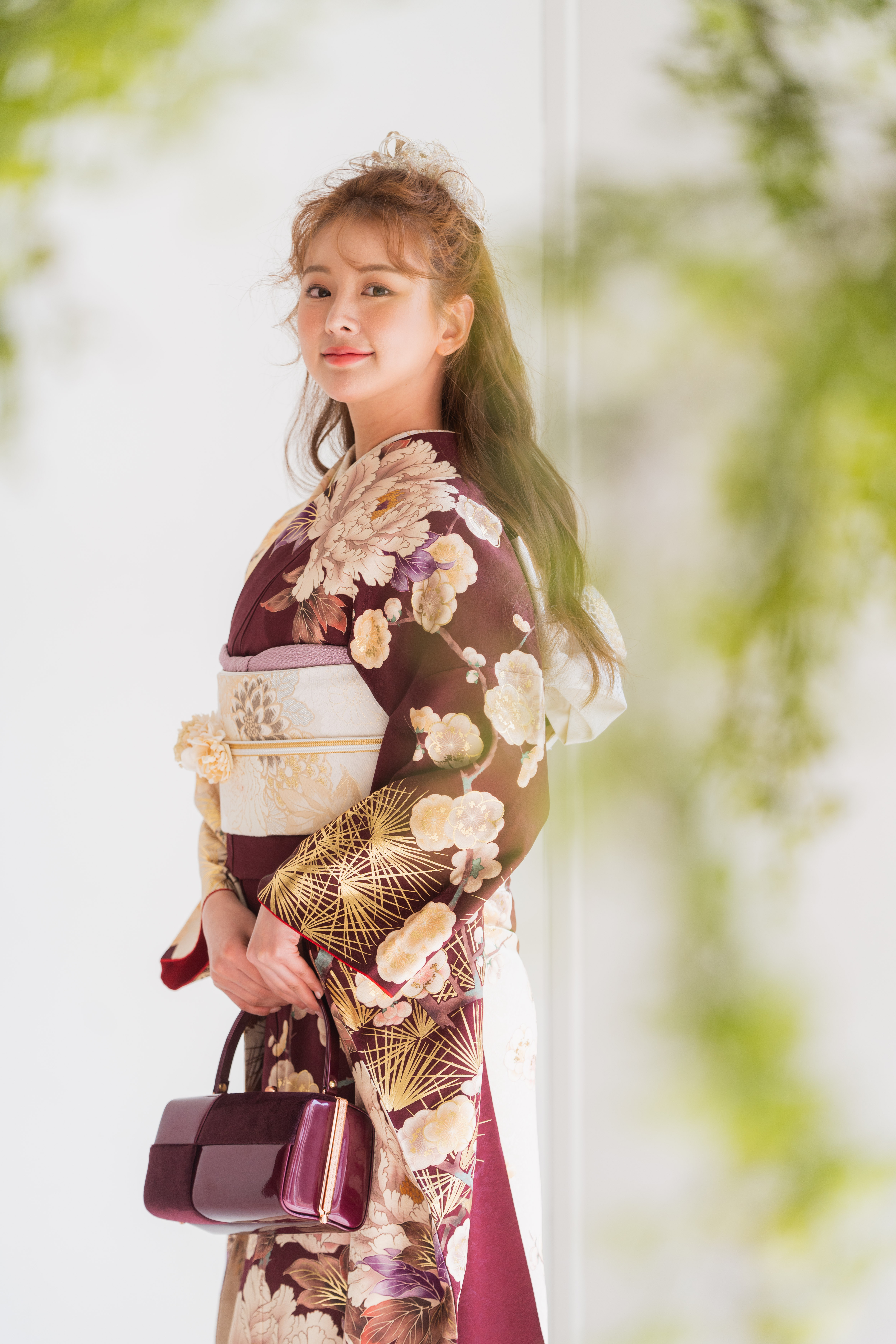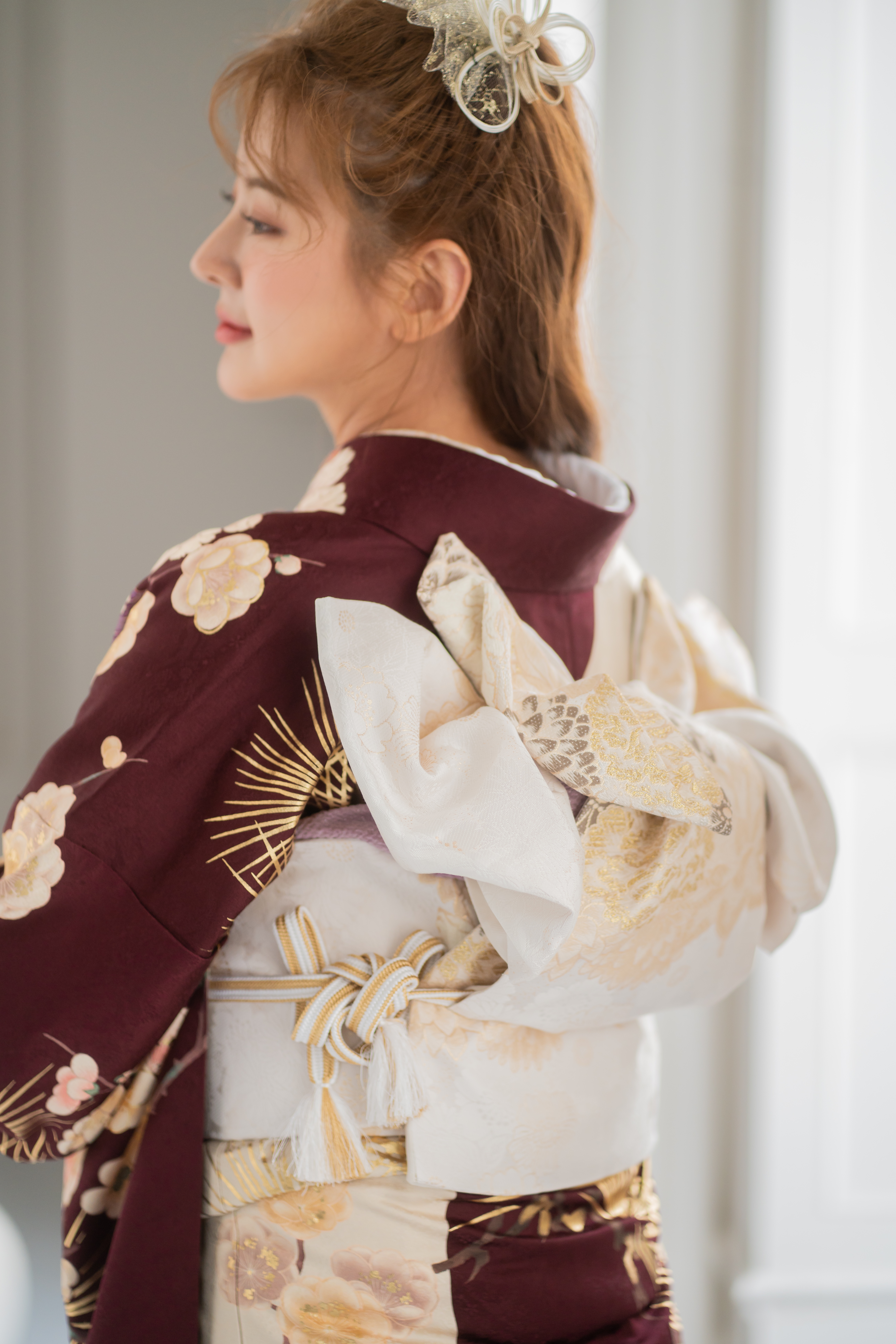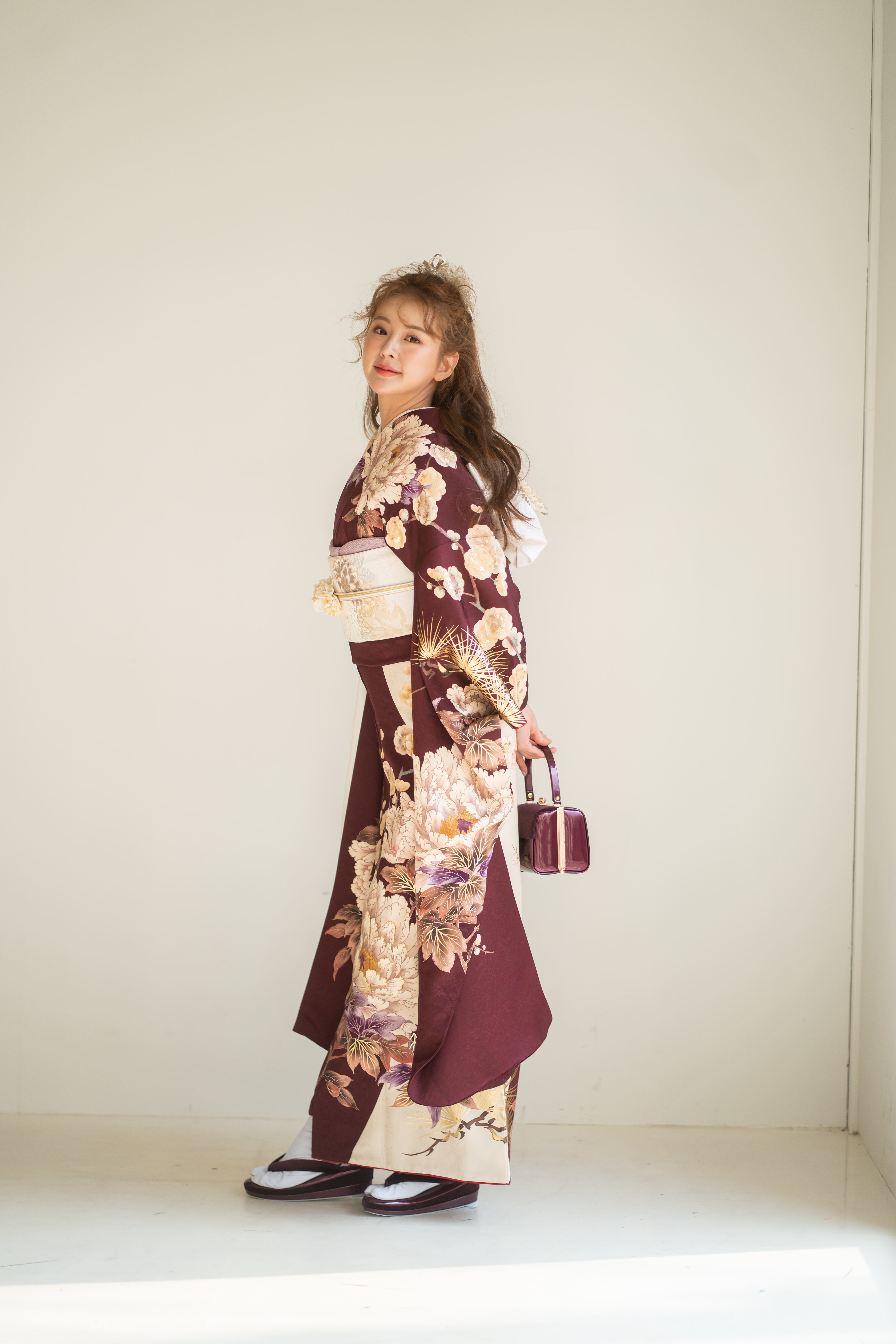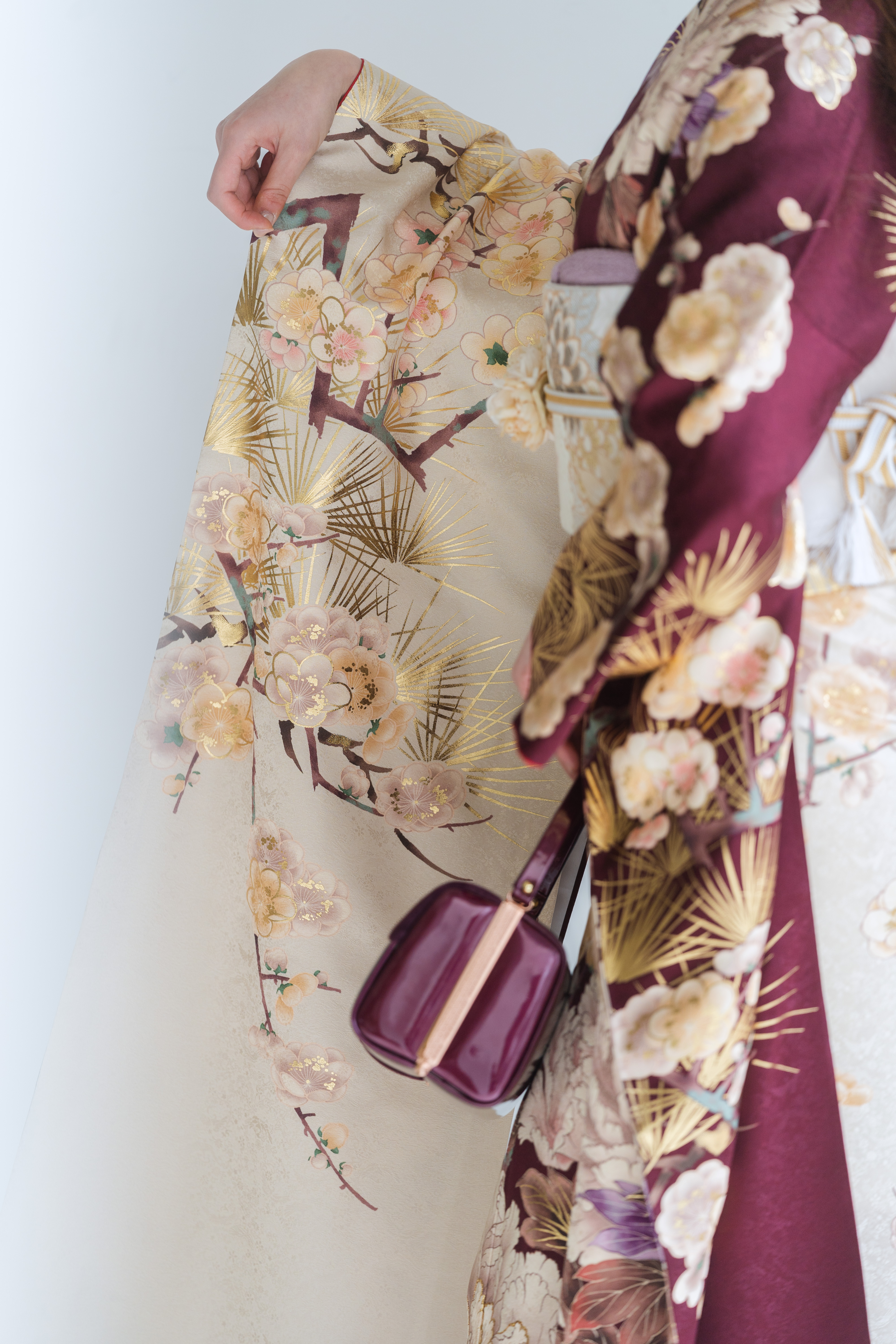 大胆な写生調子の花々と金彩針松が絶妙にコントラストされた新古典振袖です。