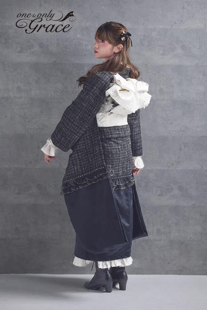 【一蔵&オンディーヌオリジナル振袖】 ツイードとフリルが、ロマンティックな可愛さを演出。 銀糸ツイードと黒ベルベットのシックな装いに、金糸フリルやレースで華やかさをプラス。特別な日のロマンティックな主役に。 《通常サイズ F寸》 ※特殊サイズにつきましては+30,000円追加料金が発生いたします。