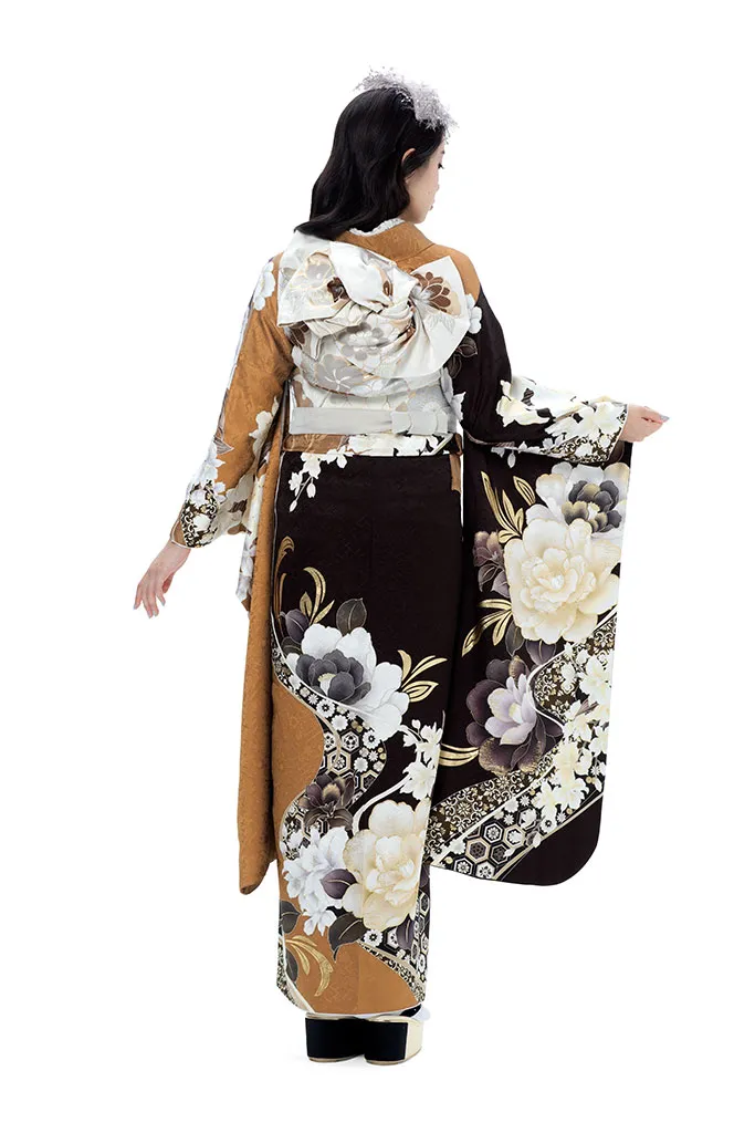 ★2025年新作振袖 【オンディーヌオリジナル振袖】 カフェオレカラーのくすみトーンをブラックで引き締めて。ウエストマークのリボンと、重衿レイヤーでおしゃれ上級者。