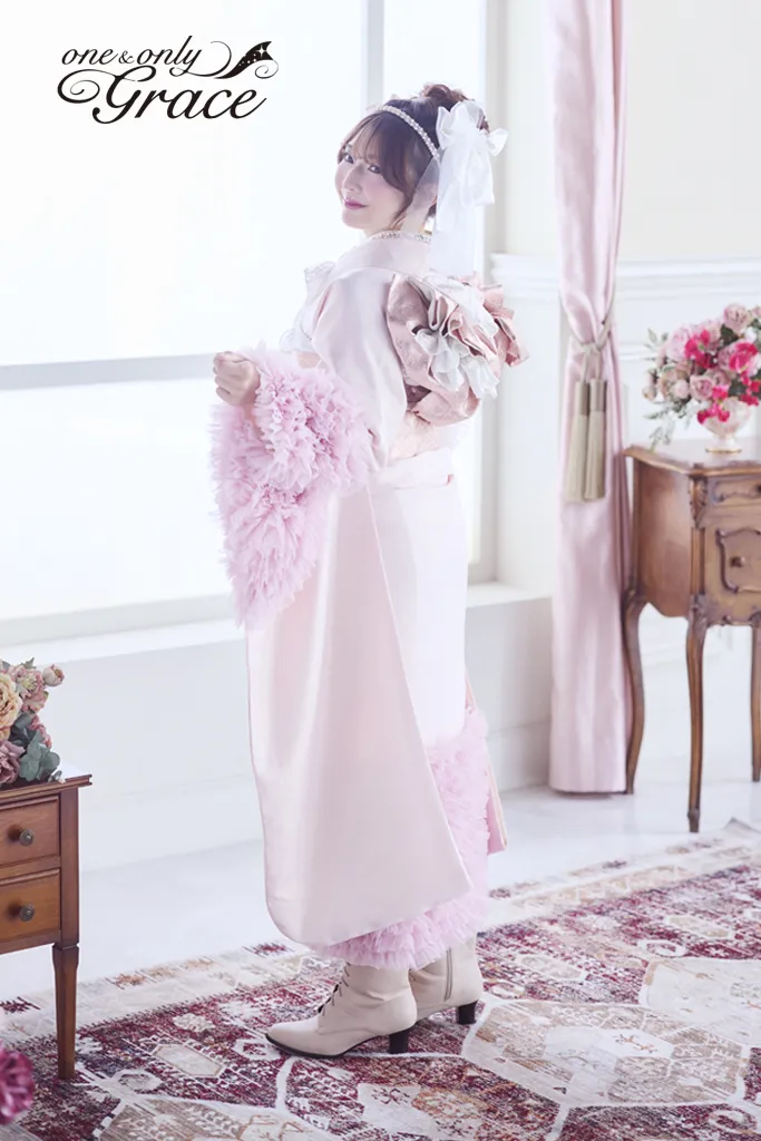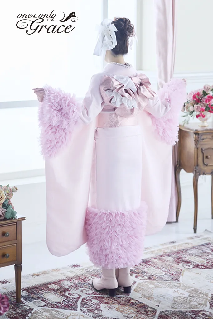 【オンディーヌオリジナル振袖】繊細な金糸を織り込んだベビーピンク生地に、袖と裾のピンクフリルで圧倒的なボリューム感をプラス。ロマンティックなシルエットで、可愛らしさを極めた主役級の一着。 《通常サイズ フリーサイズ》 ※特殊サイズにつきましては+30,000円追加料金が発生いたします。