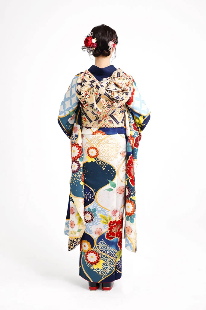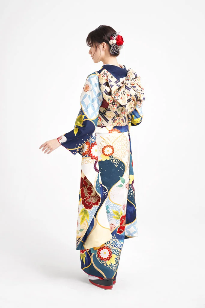 《オンディーヌオリジナル振袖》 魔除けの切子、成長を願う麻の葉、良縁が繋がる七宝・・・。幸運を呼び込む文様でポジティブなエネルギーを纏う。