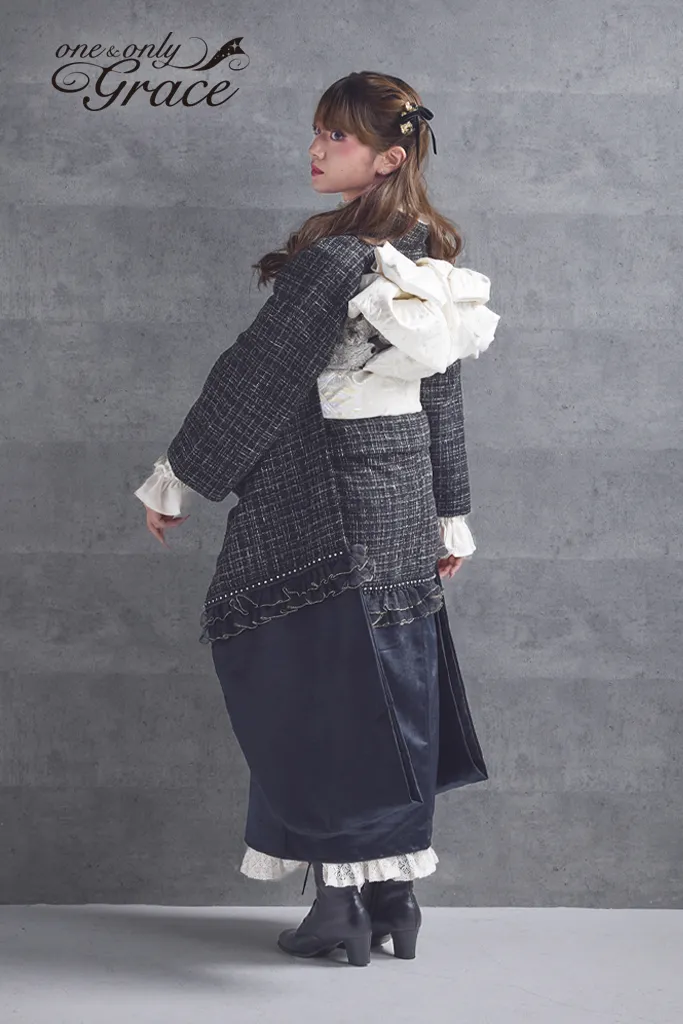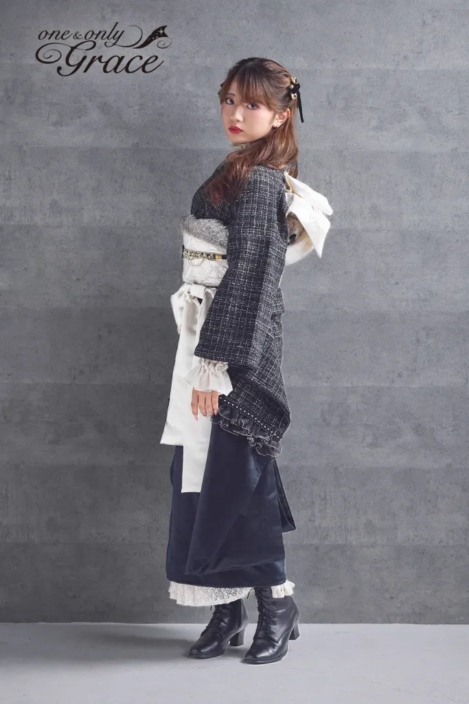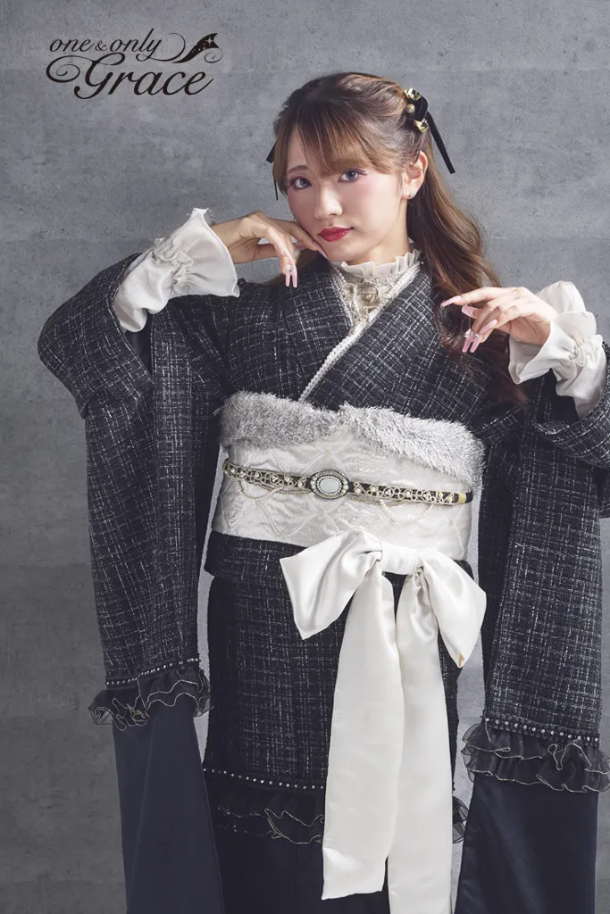 【オンディーヌオリジナル振袖】ツイードとフリルが、ロマンティックな可愛さを演出。 銀糸ツイードと黒ベルベットのシックな装いに、金糸フリルやレースで華やかさをプラス。特別な日のロマンティックな主役に。 《通常サイズ フリーサイズ》 ※特殊サイズにつきましては+30,000円追加料金が発生いたします。
