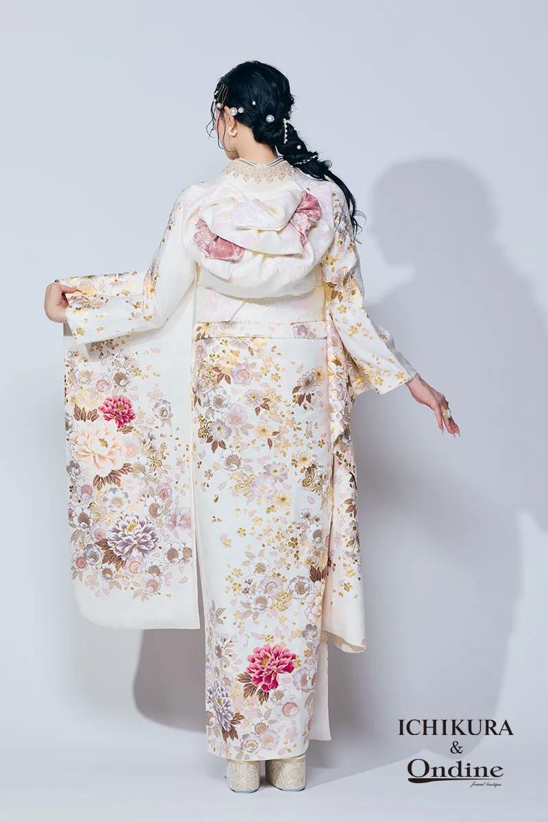 【ICHIKURA&オンディーヌ限定振袖】 奥ゆかしい白地に映えるピンクの牡丹柄にうっとり。全身にパールをちりばめて品よくラブリーに。