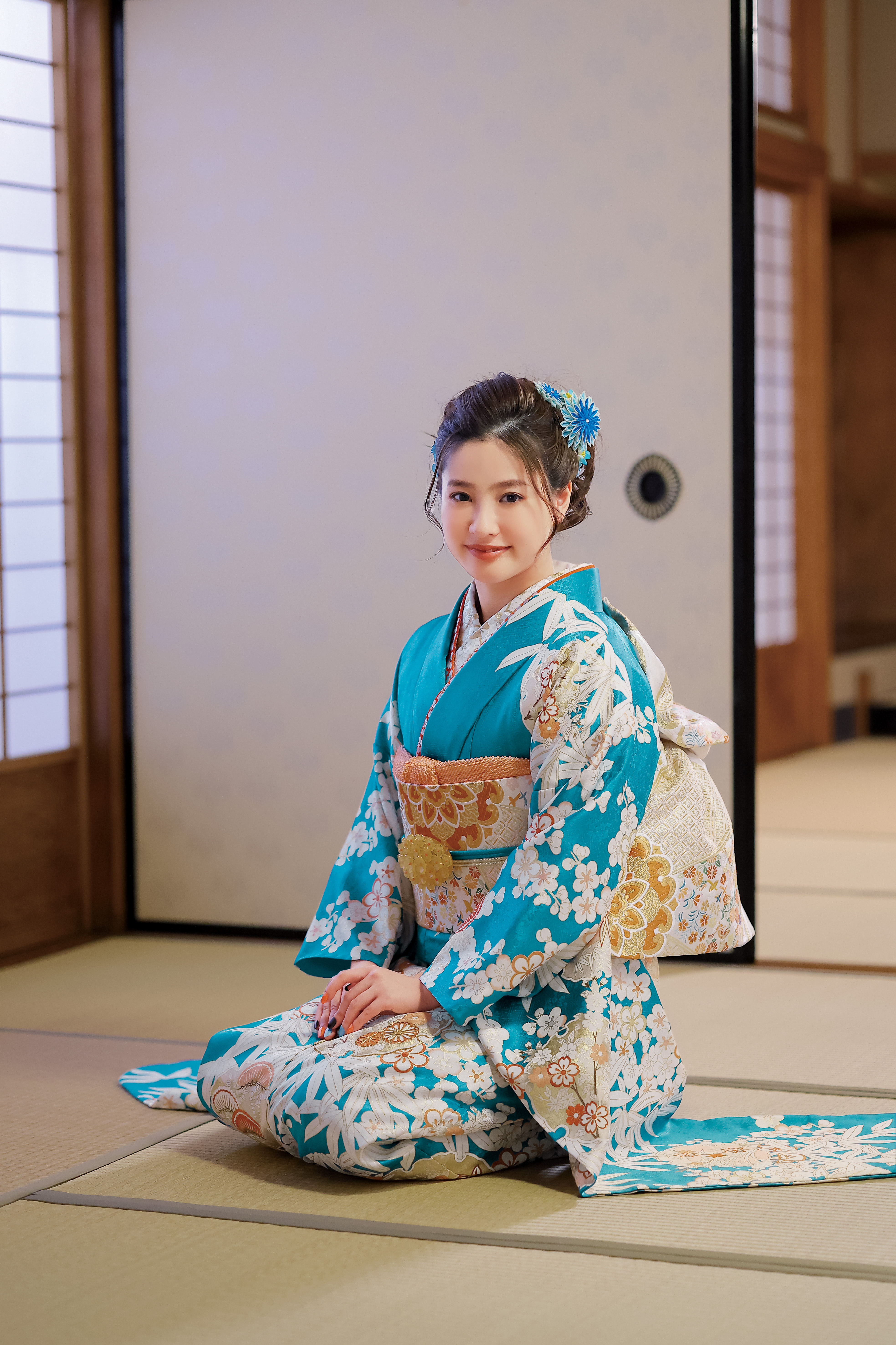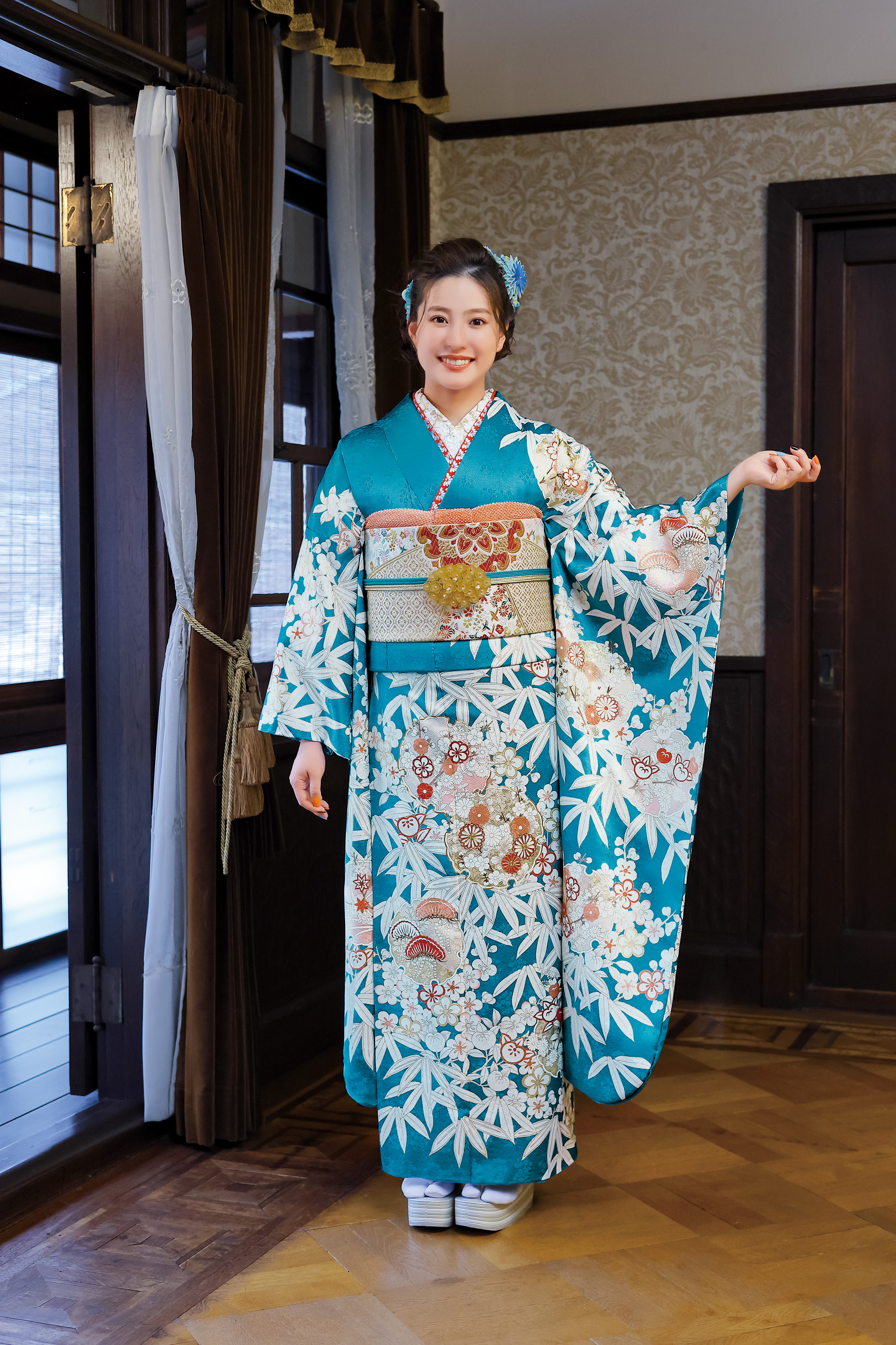 澄み渡った青空のようなターコイズと白の組み合わせが秀逸な逸品。 手描き友禅ならではの品格が宿った振袖をあなたに。