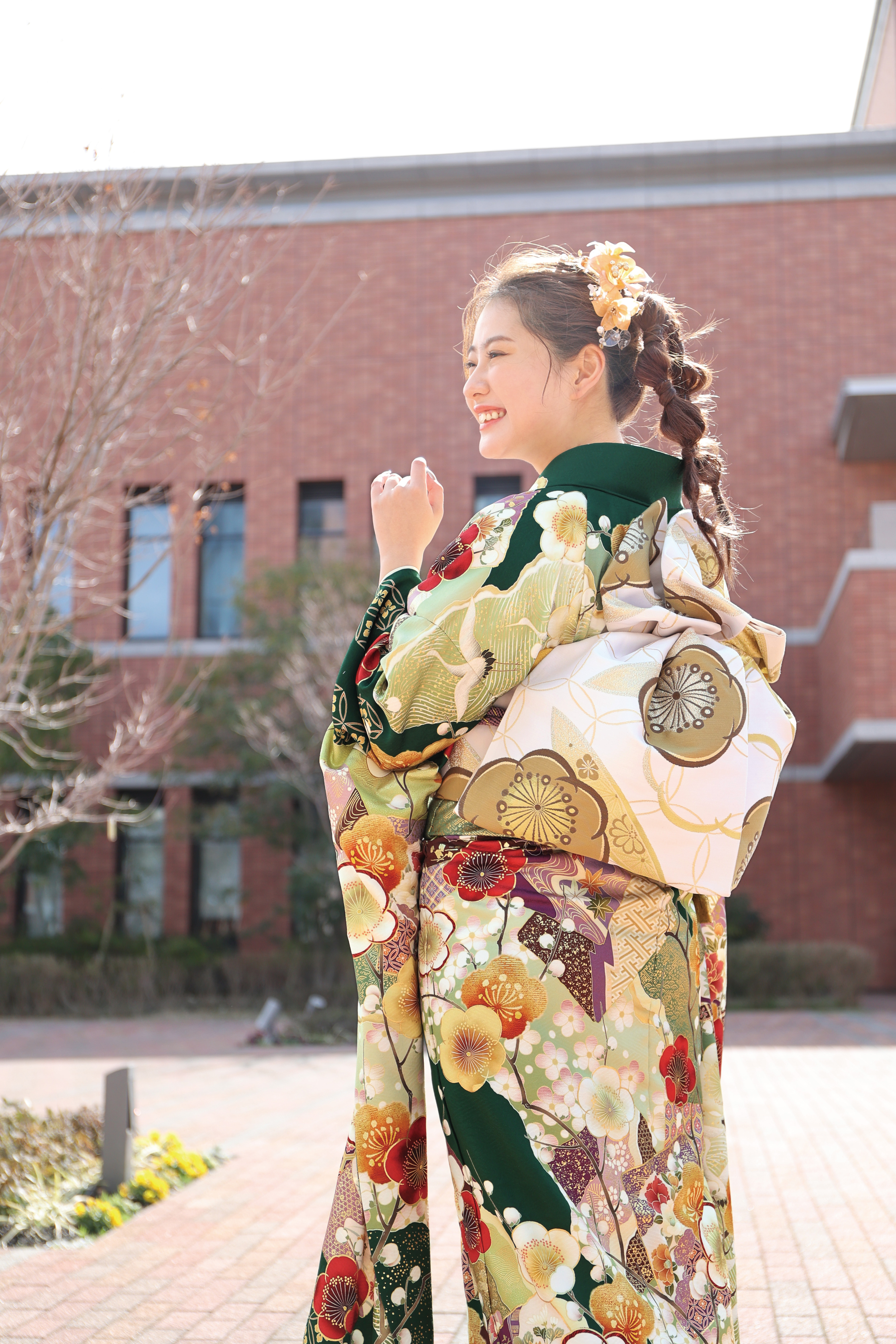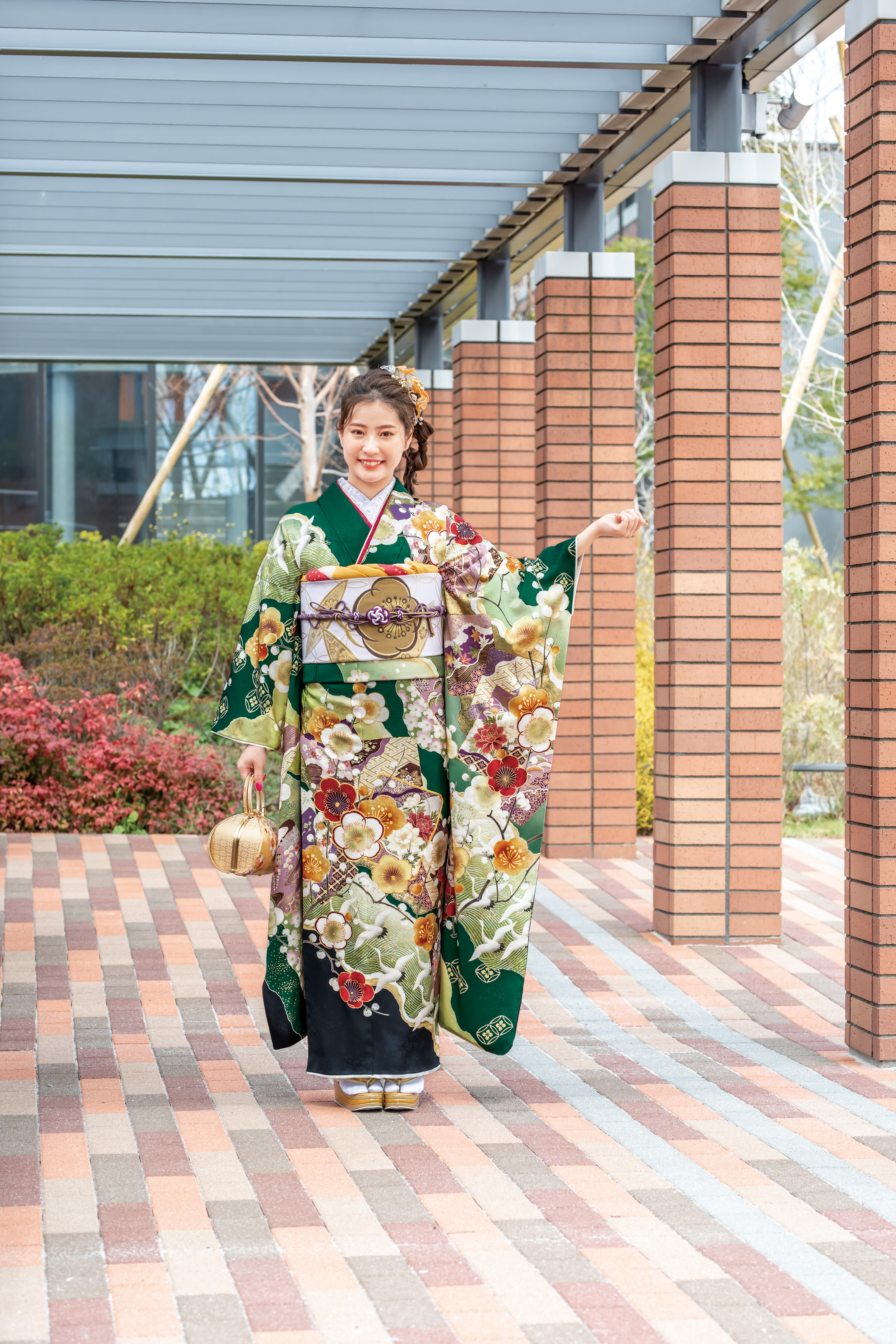 肌馴染みの良いグリーンと墨黒の色合わせが美しい、大人っぽい表情の振袖。 仲睦まじく羽ばたく鶴と梅の優しい香りが感じられる正統派振袖。