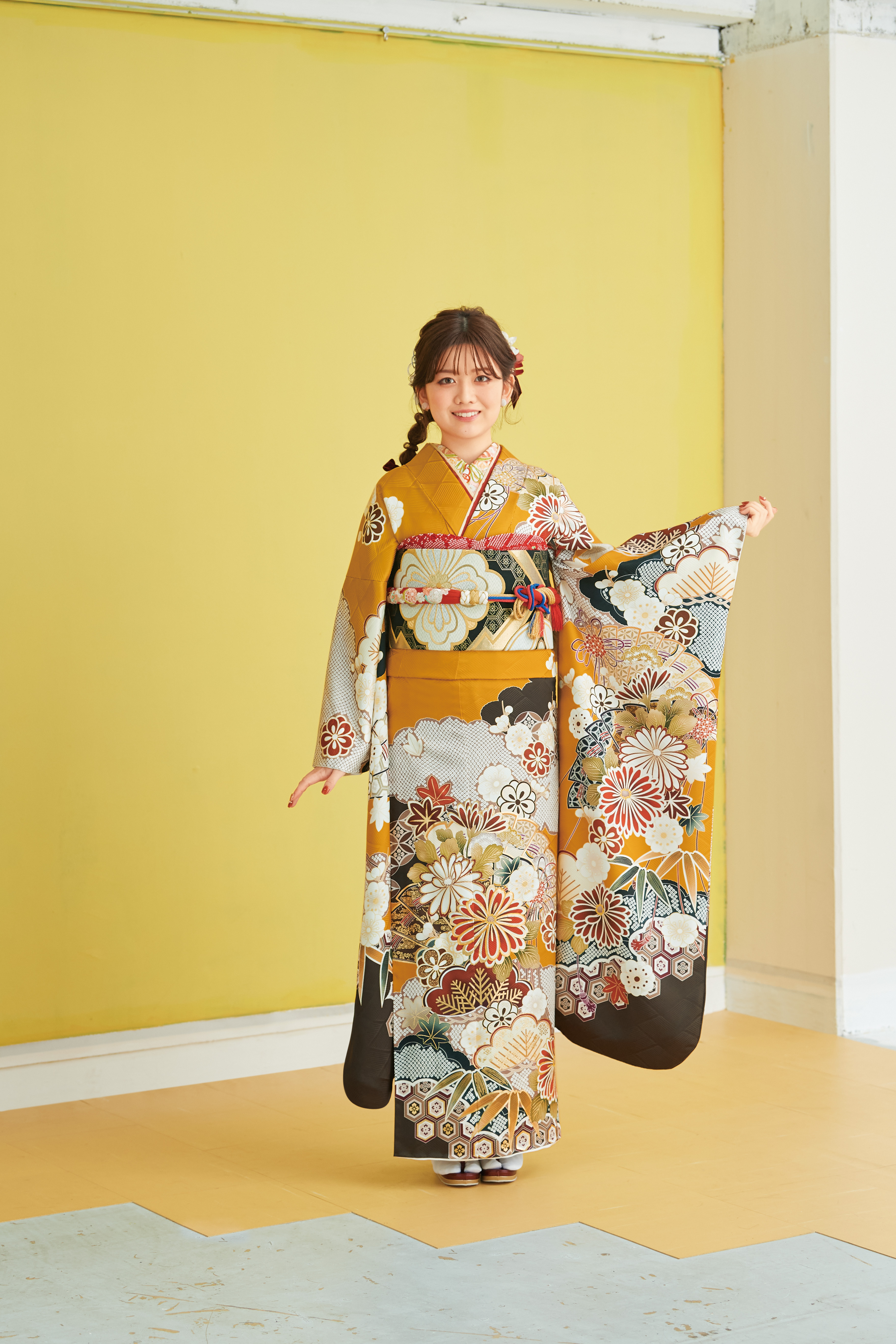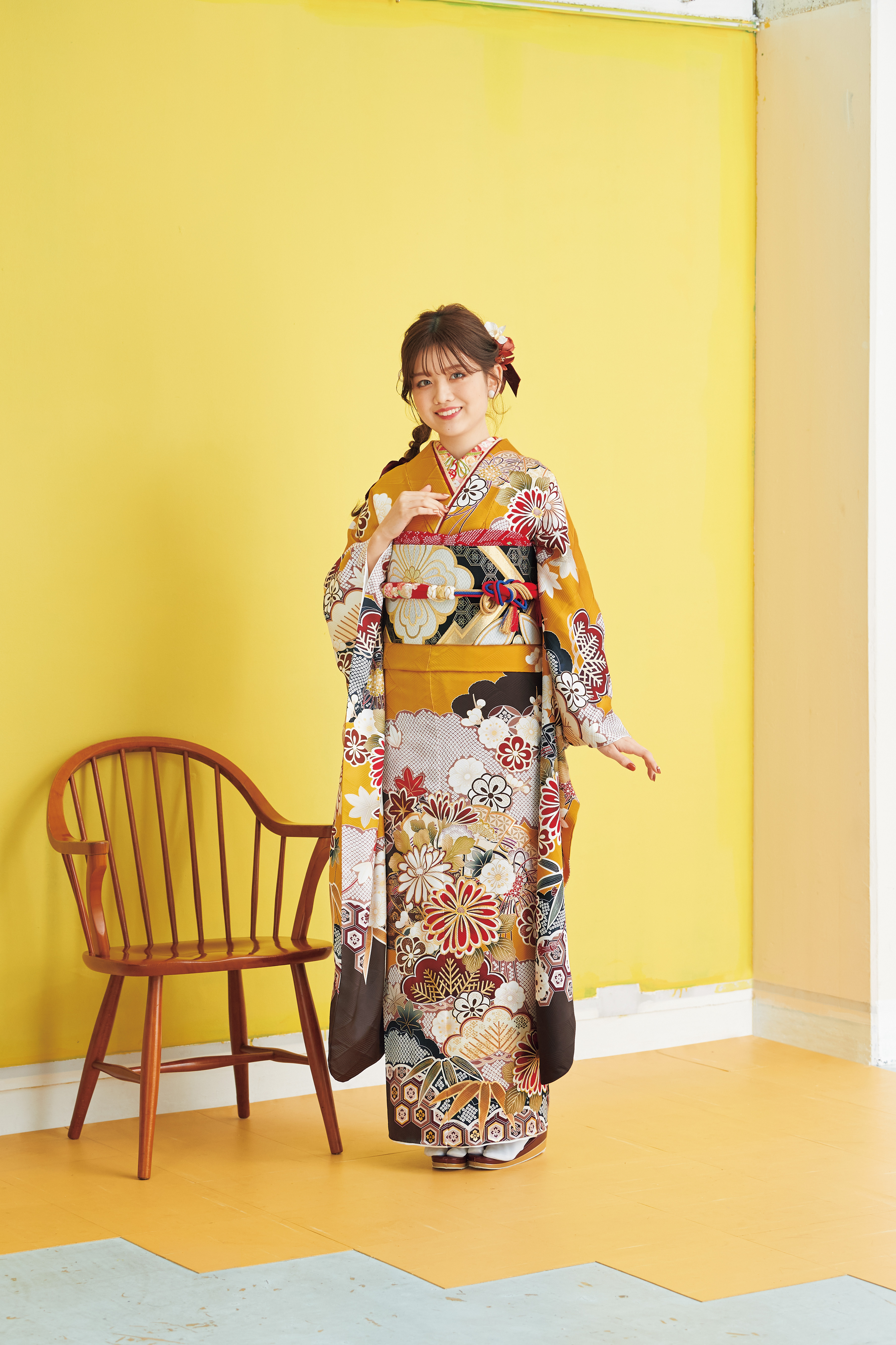 からし色がベースでレトロ好きが心惹かれる配色の、ノスタルジックな王道おしゃれ振袖。 くすみがかったカラーで、トライしやすい絶妙なレトロ感。