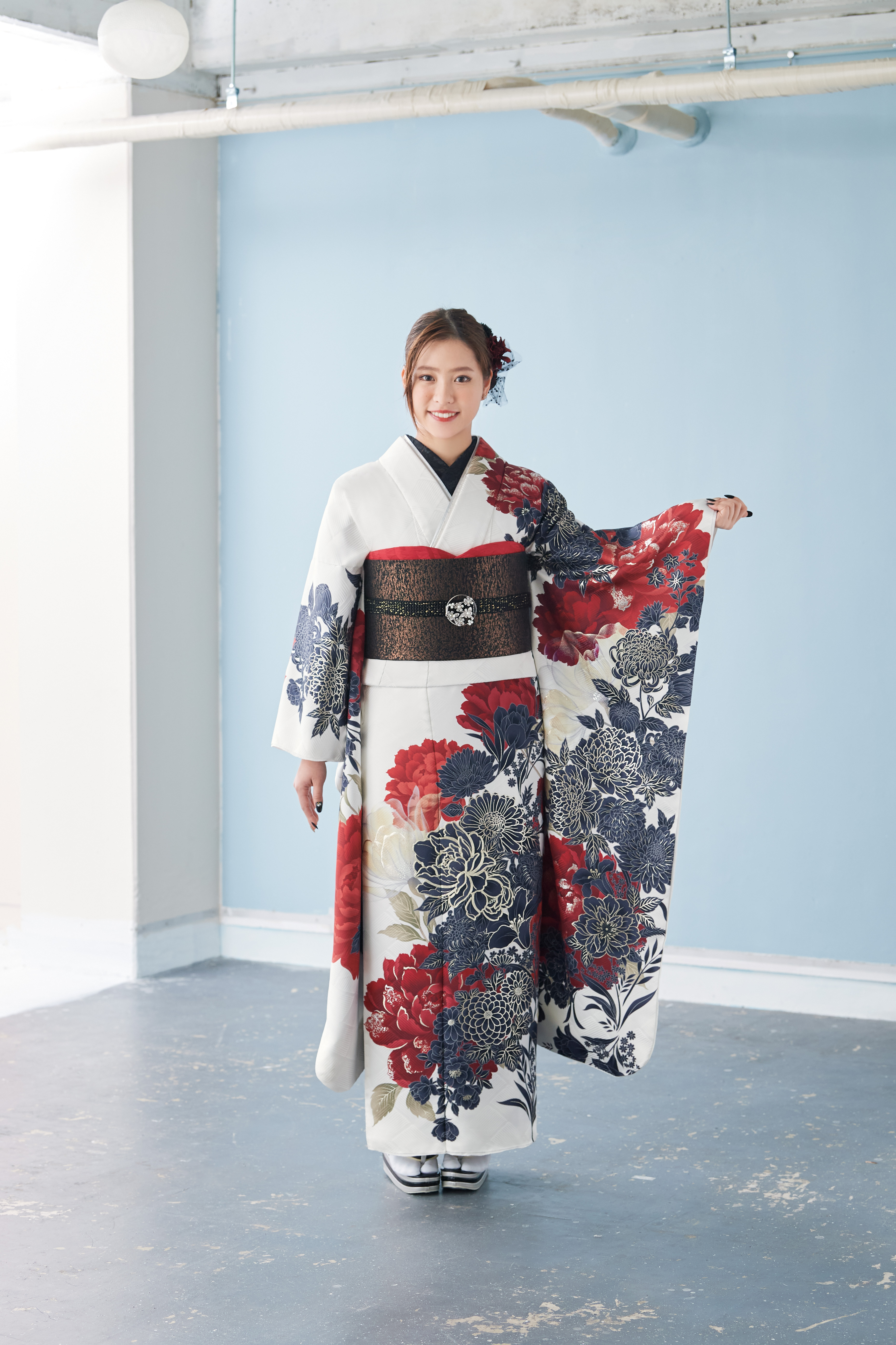 潔い模様と混じりけのない白地だからこそ映える、コントラスト強めのインパクトある印象振袖。 金彩銀彩も含めて、互いの存在を引き立てあうカラーリングだからこそ、クール派女子を引き立てる鮮烈な逸品。