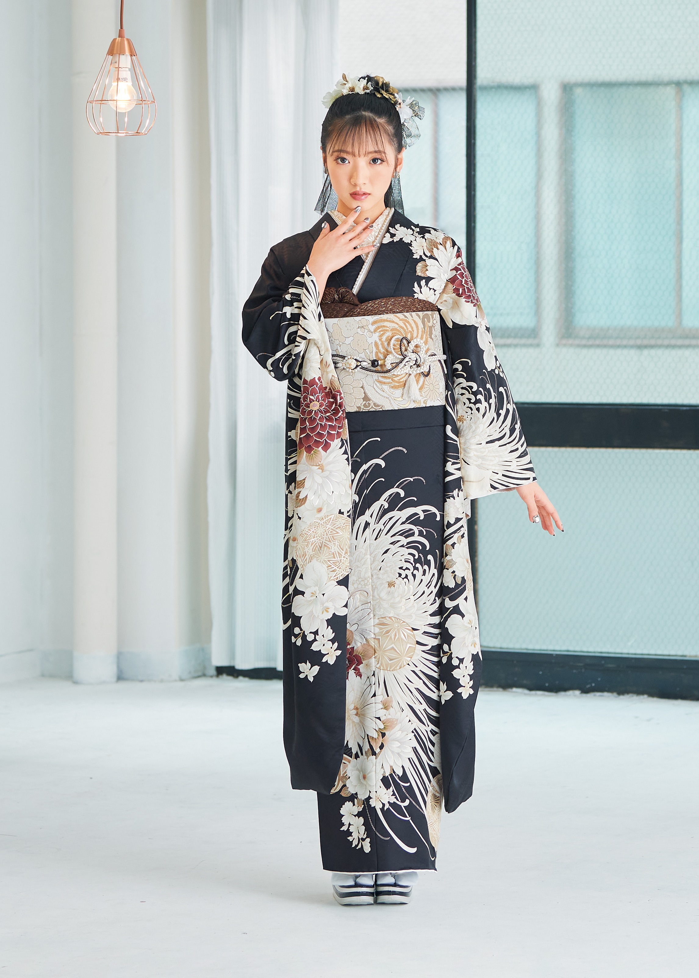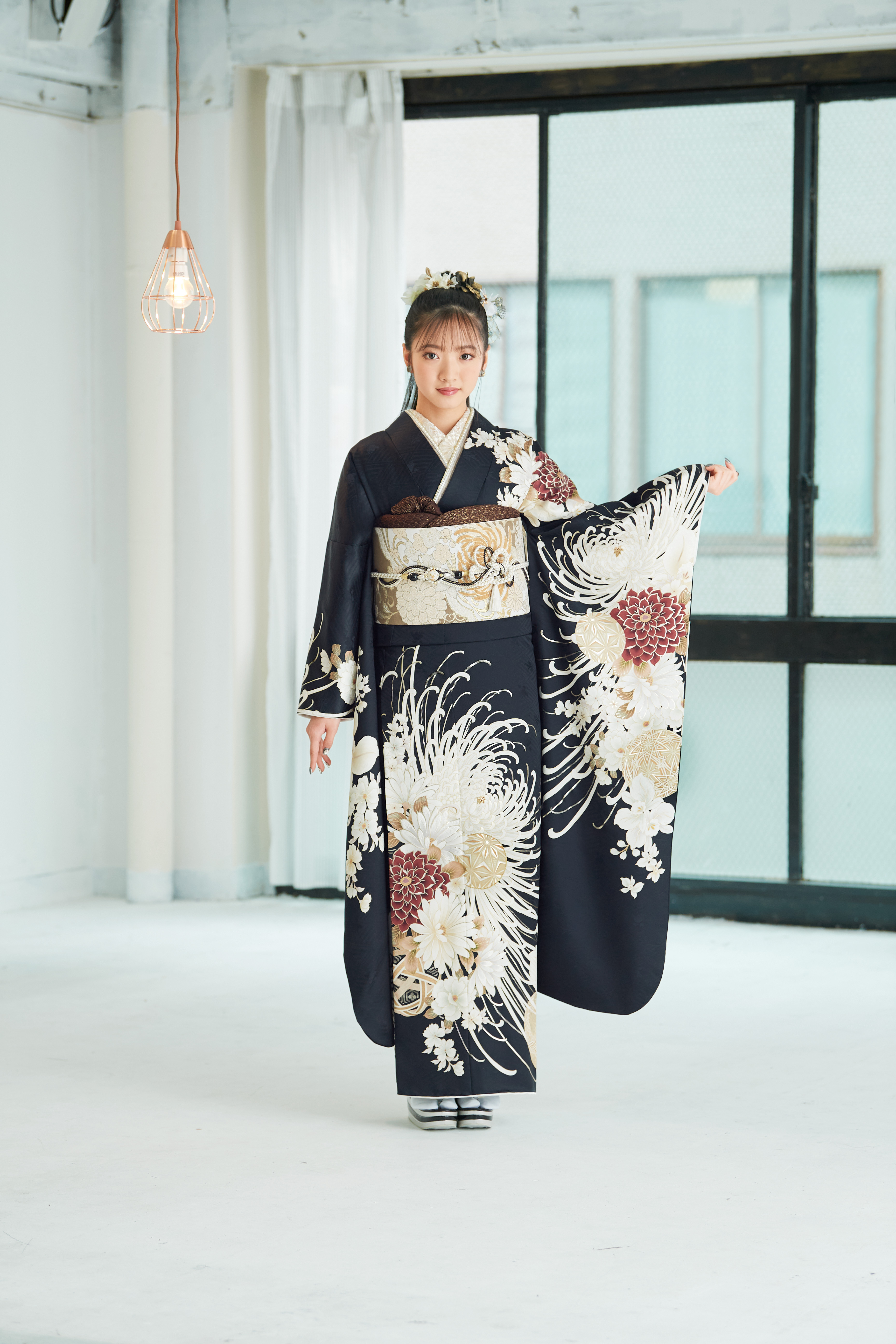 ブラックとホワイトの対比カラーが、凛とした美しさを引き立てるグラマラスなクール振袖。 顔周りも引き締まり、メイク映えする逸品です。