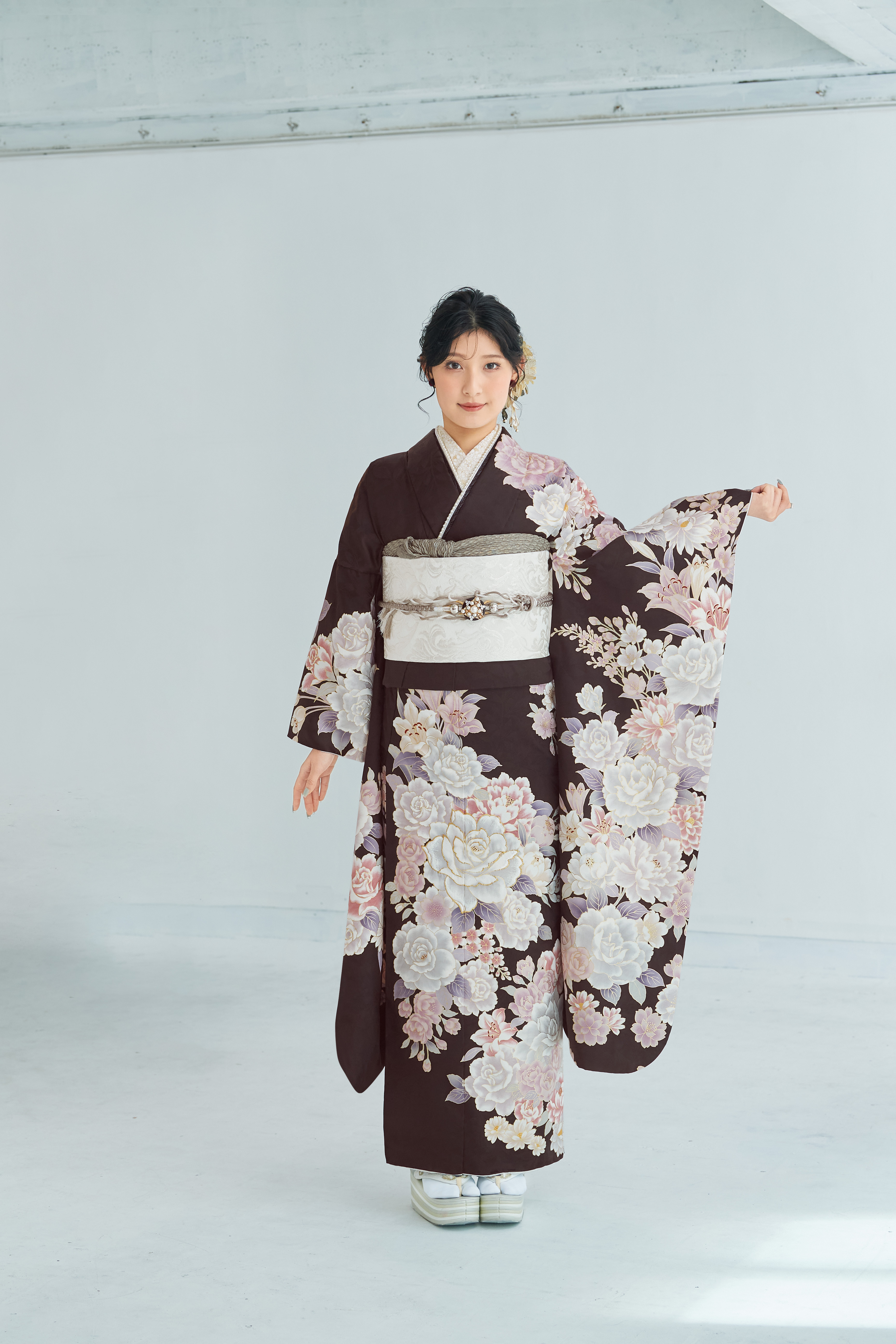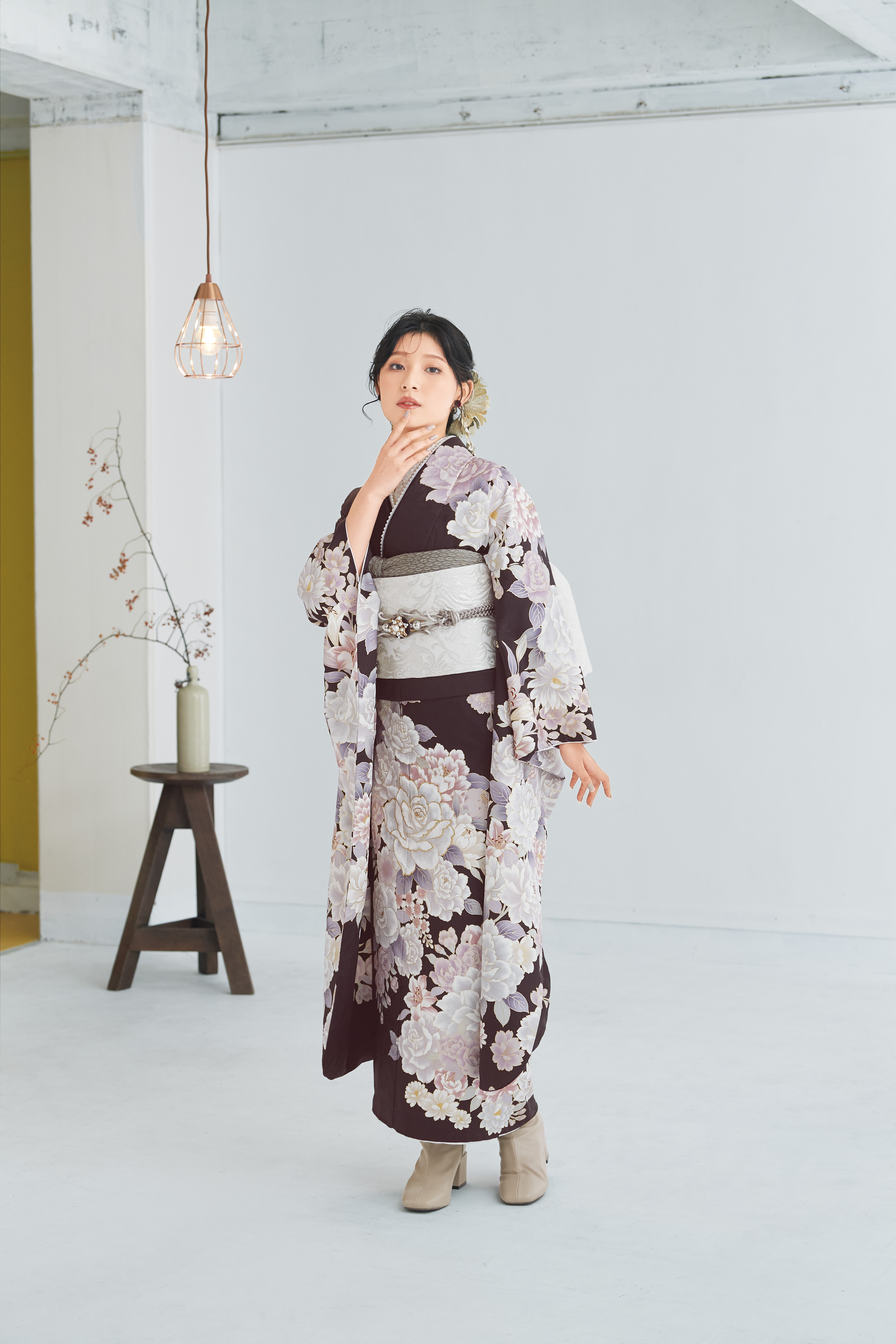 装う人の品格を引き出す華やぎのダークブラウンと、トレンドのニュアンスカラーの花々が美しい上品なモード振袖。 シンプルな配色ながら、柄行の華やかさが際立つので、ブーツスタイルも品よくキマります。
