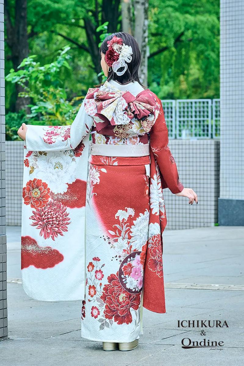 【ICHIKURA&オンディーヌオリジナル振袖】 白地に華やぐ大輪の牡丹と紅白で紡ぐ、ハレの日にピッタリの一枚。
