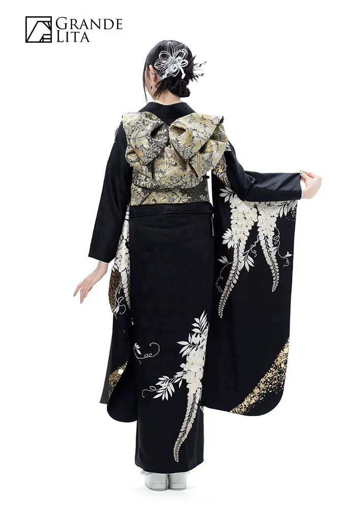 【2025年新作振袖】《オンディーヌオリジナル振袖》漆黒に輝く黄金の下がり藤 生命力の強いその花のようにしなやかに、気高く。