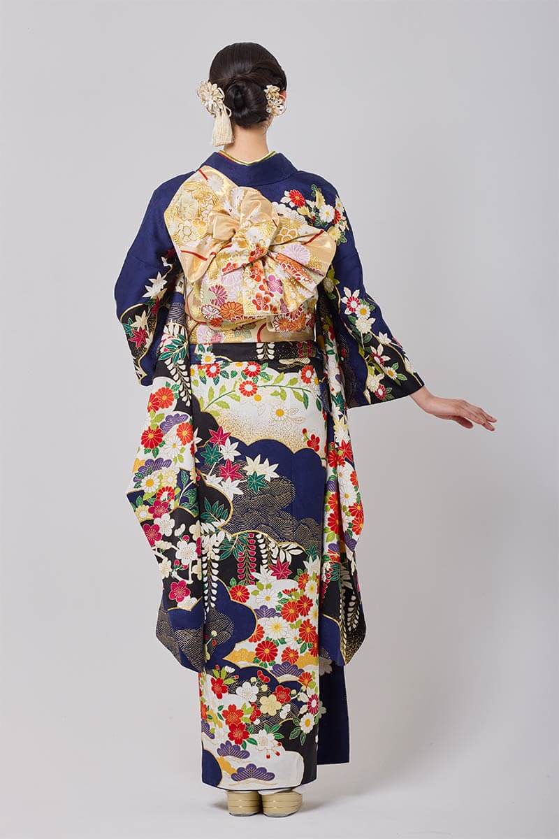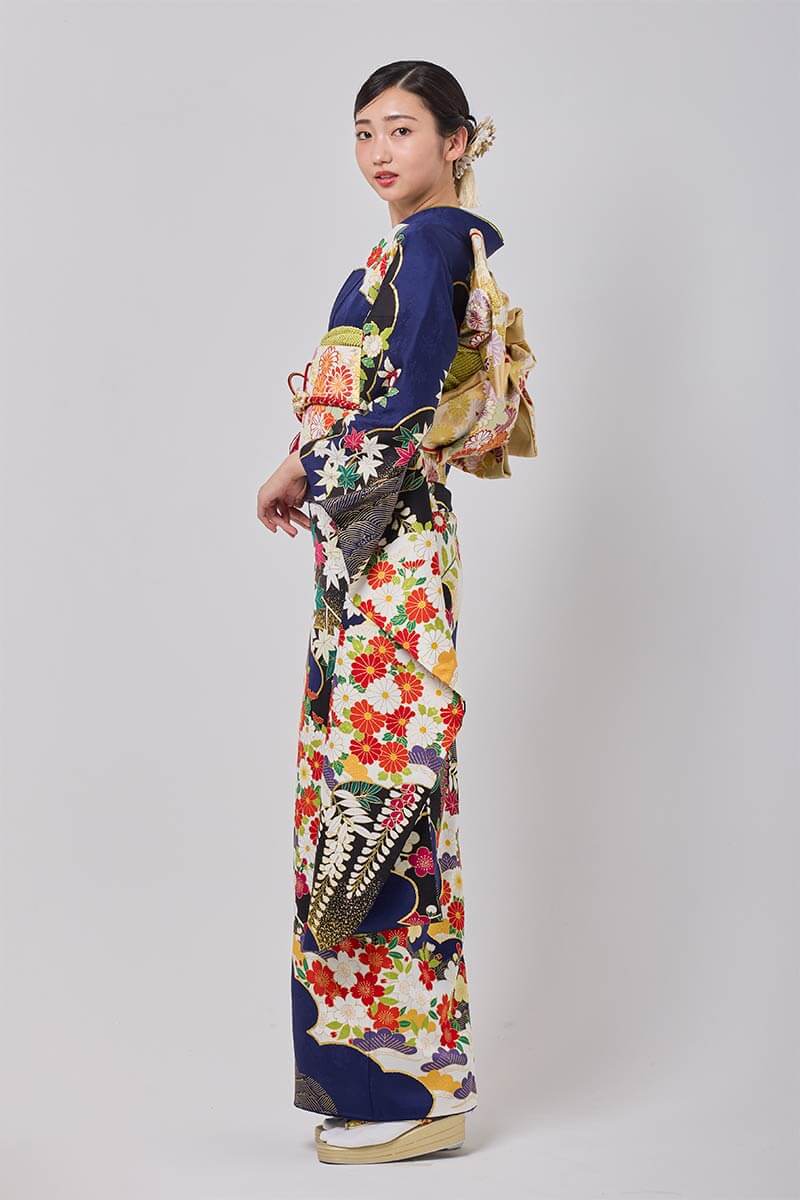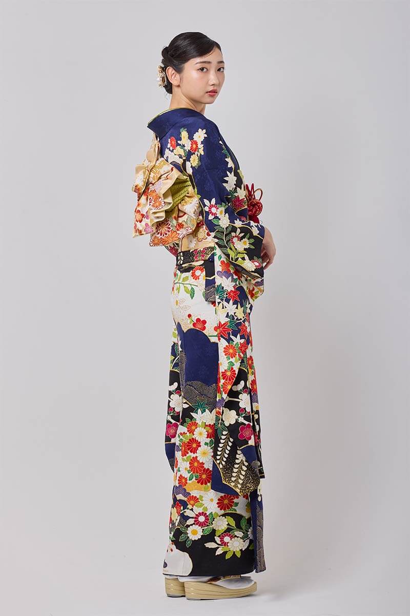 深い紺地に華やかな花模様が映える豪華な振袖