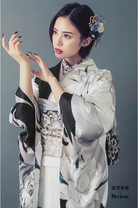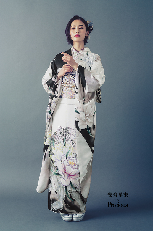 凛とした美しさが際立つ、ホワイト×シルバーのモード振袖。 大胆に描かれた虎と花が放つ存在感は、まさに圧倒的。 芯の強さと品格を兼ね備えたスタイル