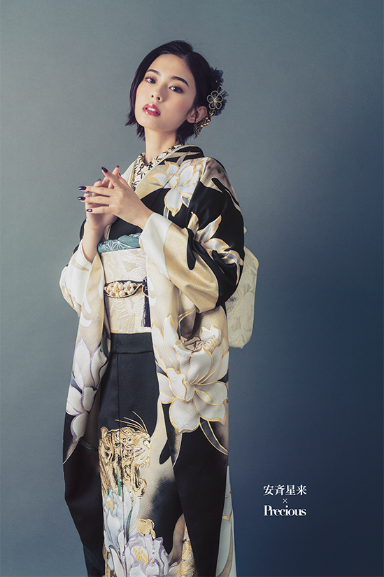 凛とした美しさが際立つ、黒×金のモード振袖。 大胆に描かれた虎と花が放つ存在感は、まさに圧倒的。 芯の強さと品格を兼ね備えたスタイル