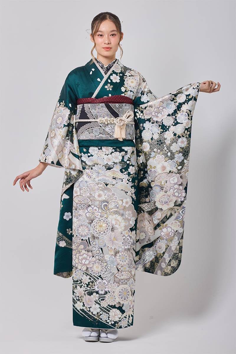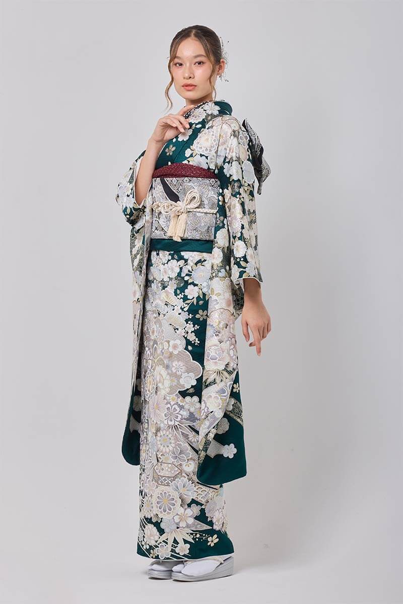 深い緑の色合いと金彩が美しく、品格と知性を感じさせる雰囲気の中に、ふわりと咲く和花が映える1枚。
