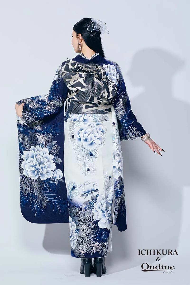 【ICHIKURA&オンディーヌ限定振袖】 パワーみなぎる乱菊や大ぶりな牡丹など華やかな古典を、メタリックな輝きでパンチを効かせて大胆に主張。ラインストーンやビジューなどグリッター小物で盛り上げながら、媚びないクールなスタイリングで強気コーデの完成。