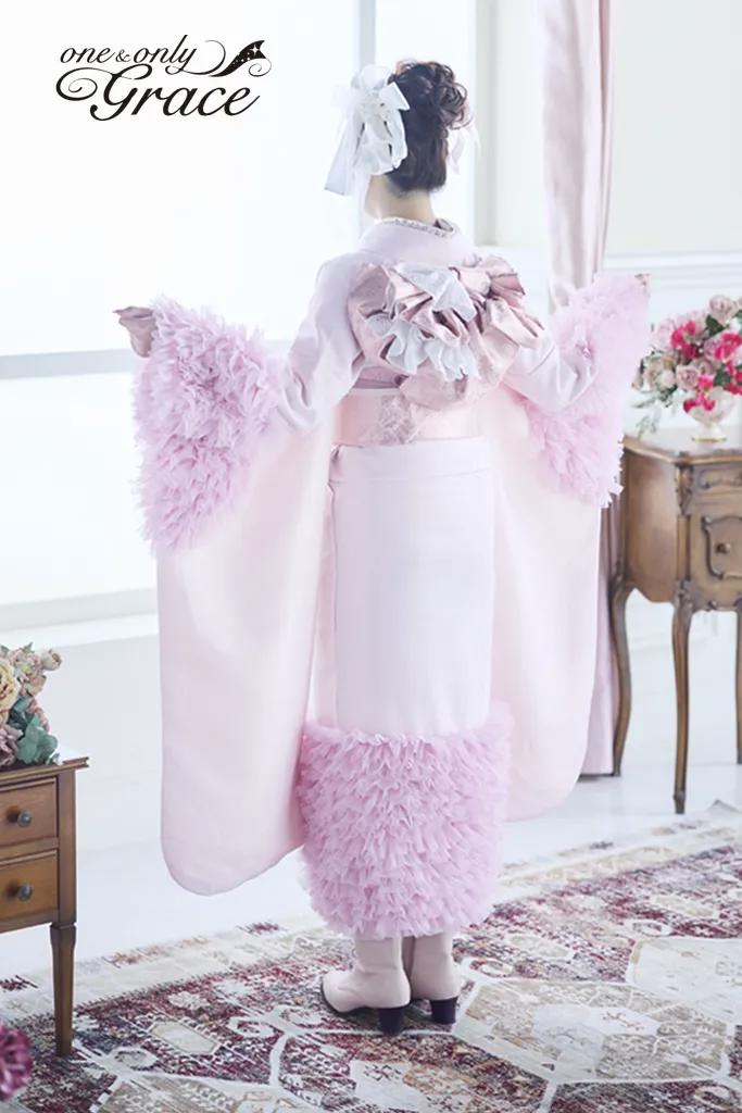 【一蔵&オンディーヌオリジナル振袖】繊細な金糸を織り込んだベビーピンク生地に、袖と裾のピンクフリルで圧倒的なボリューム感をプラス。ロマンティックなシルエットで、可愛らしさを極めた主役級の一着。 《通常サイズ F寸》 ※特殊サイズにつきましては+30,000円追加料金が発生いたします。