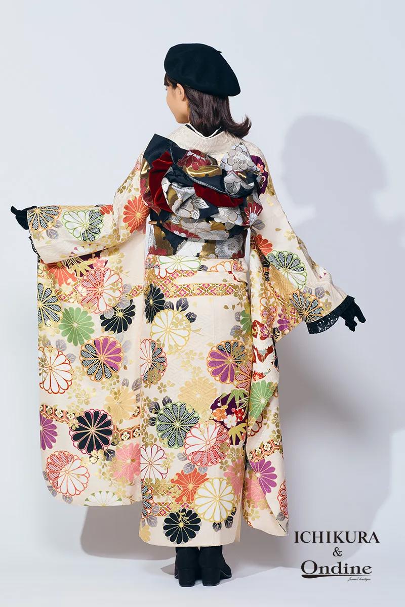 【一蔵&オンディーヌオリジナル振袖】 おめでたい古典柄に彩られたまろやかなクリーム色。ブラックレースで引き締めてレトロ可愛く。