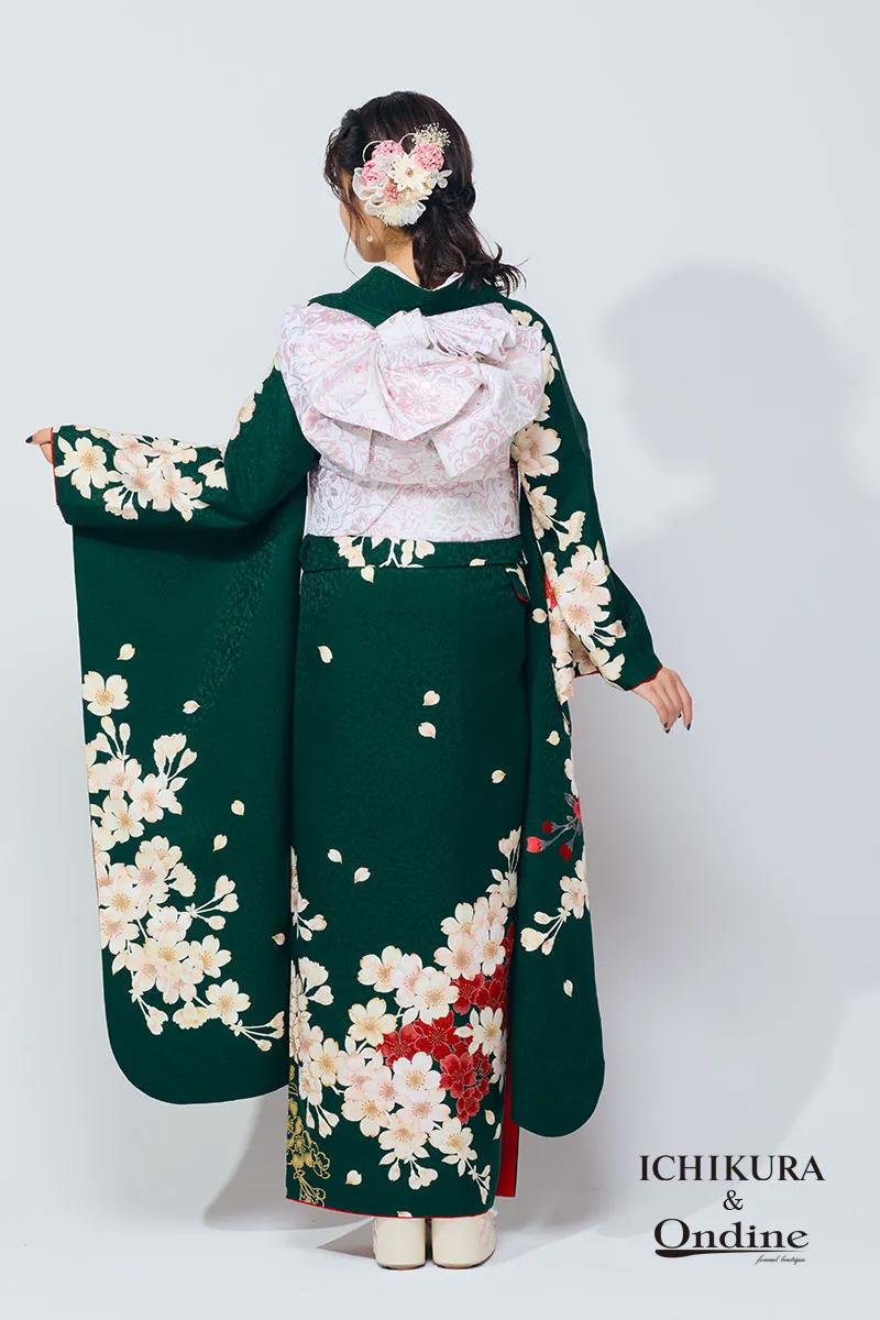 【ICHIKURA&オンディーヌ限定振袖】 濃緑の上で咲き誇る爛漫の桜たち。撫子柄の刺繍で立体感をたたえて。